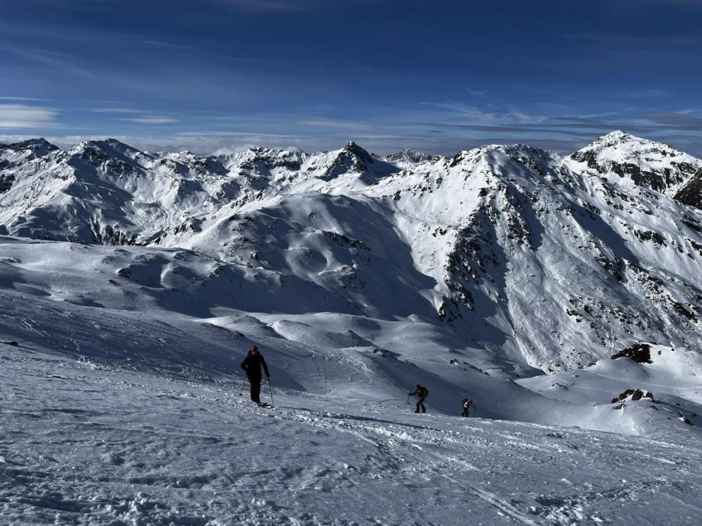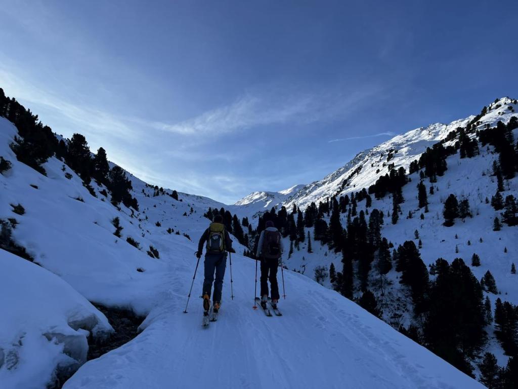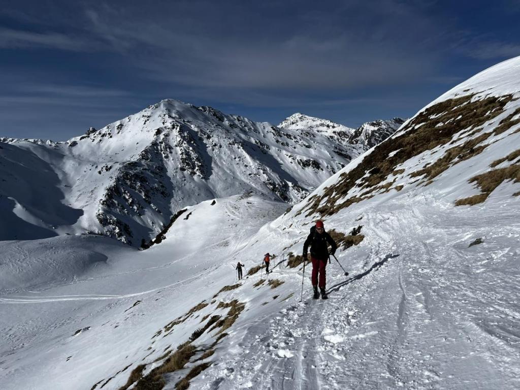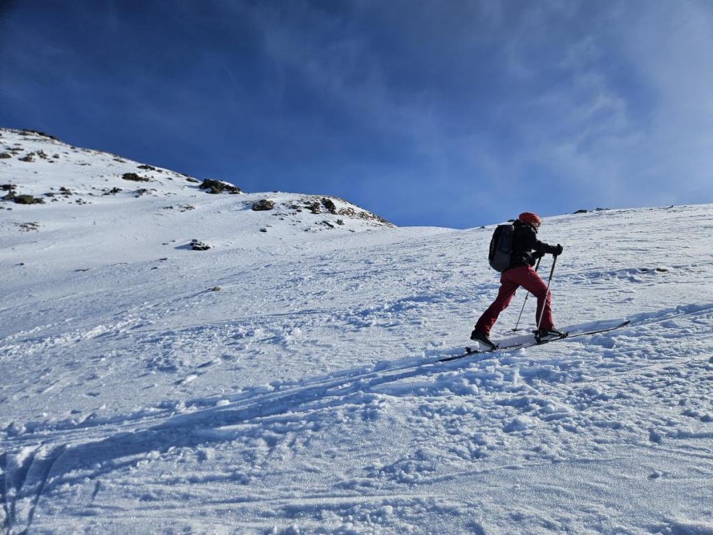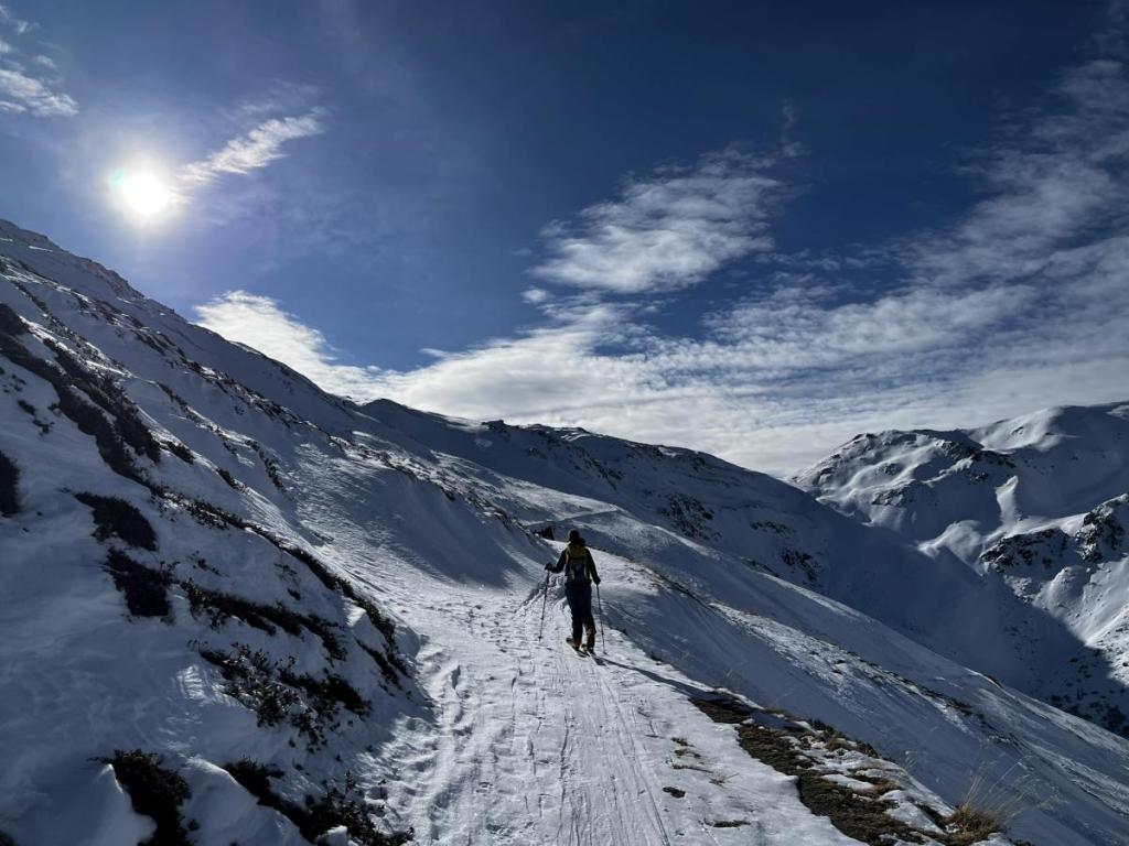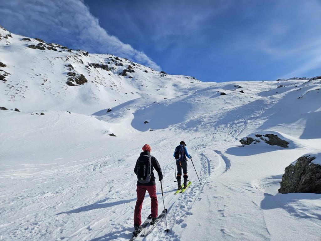 Nun zieht die Spur über schöne Skihänge, leider mit relativ wenig Schnee immer weiter Richtung Tourenziel.