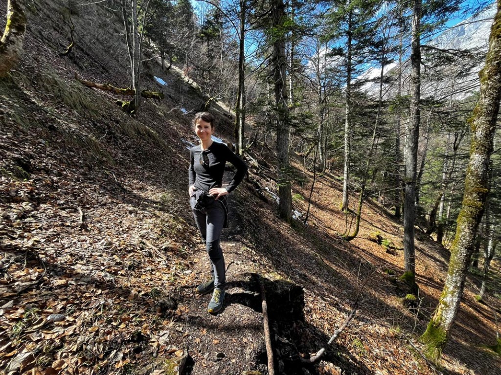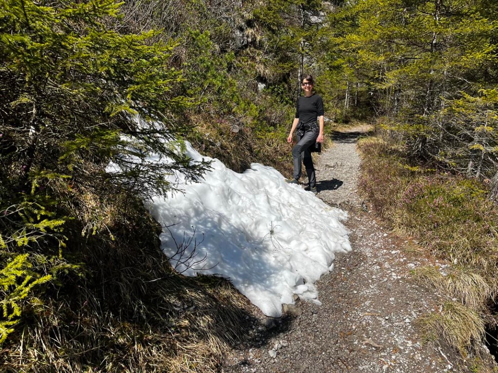 Nun wandern wir in flacherem Gelände höher und höher, vor dem Steilhang bei der Mittelstation zweigen wir auf den Forstweg ab, der uns in Richtung Patscher Alm bringt. Die Sonne ist mittlerweile ganz heraussen und es ist wunderbar angenehm zu gehen.