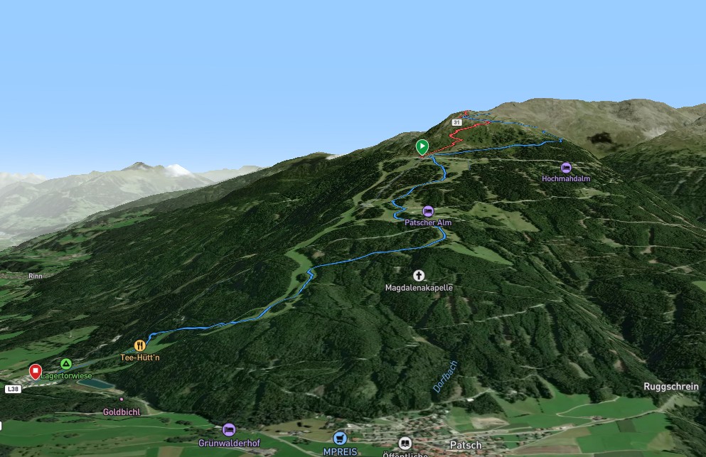 An der Patscher Alm vorbei, erreichen wir erst wieder die Piste, um dann oberhalb der Mittelstation in Richtung Bergstation zu gehen. Am Funpark ist die Jugend (und Jung gebliebenen) am werken.
