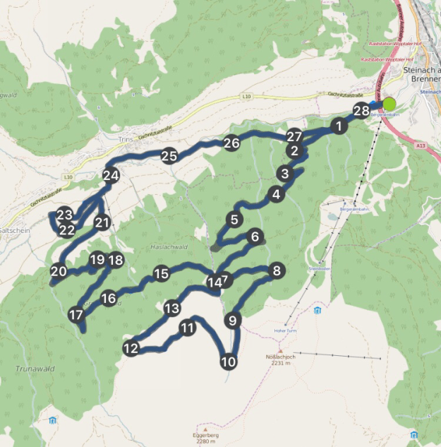 Eine kurze Verschnaufpause, dann geht es auch schon weiter, über den Wanderweg 44 geht es wieder hinunter zur Gerichtsherrnalm und dann über den Forstweg und wieder vielen Geocaches hinunter in die Galtschein-Siedlung von Trins.