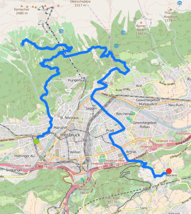 Bald erreiche ich Mühlau, durch die Stadt erreiche ich meinen Standardweg hinauf nach Hause. Die letzten paar Höhenmeter laufen heute extrem gut, dann habe ich mein zu Hause erreicht. Alles gut gegangen.