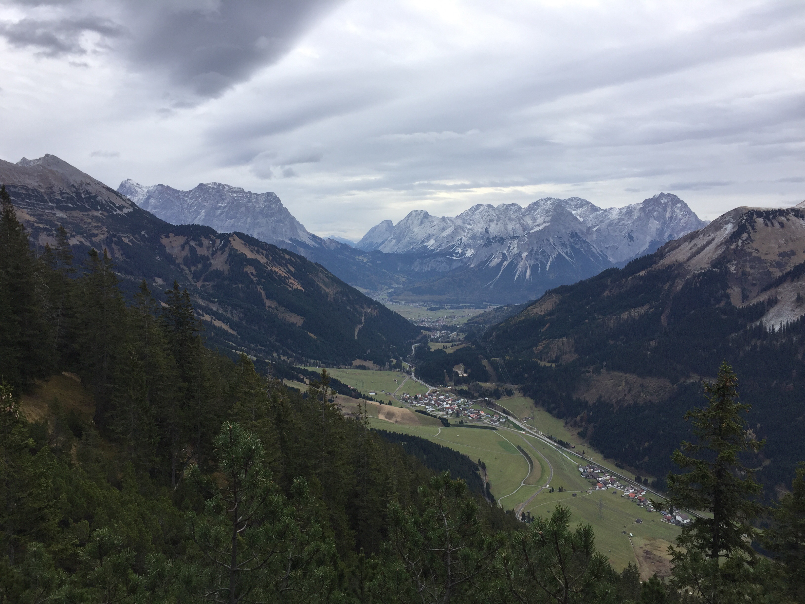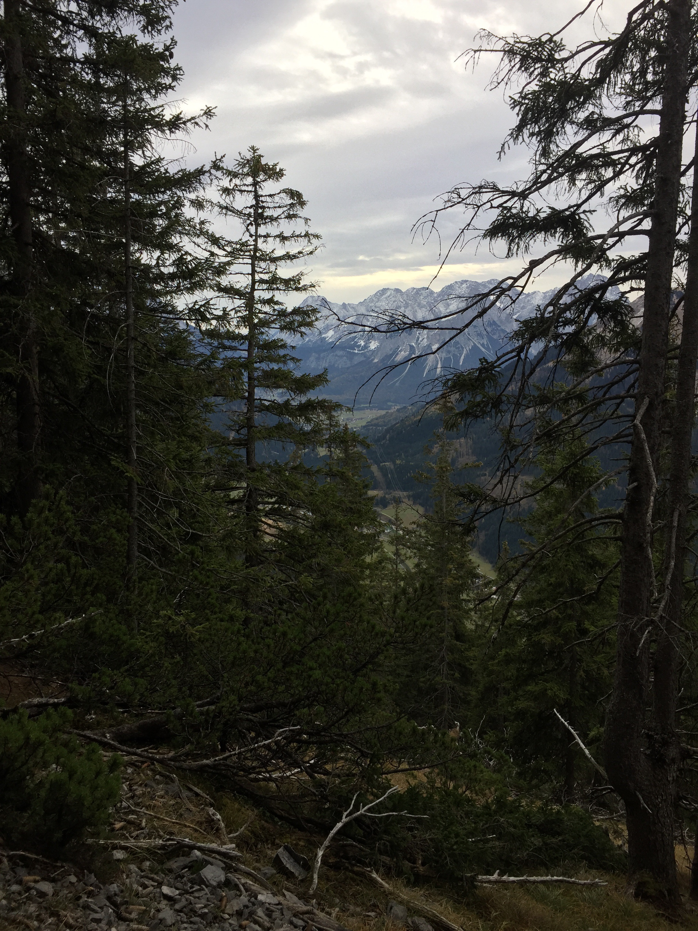 Obwohl es bewölkt ist, ist der Aufstieg angenehm. Es geht gleich rauf, zuerst durch Wald, dann eröffnet sich der erste Blick auf den Talkessel von Ehrwald, mit Zugspitze und Sonnenspitze. Sehr schön…