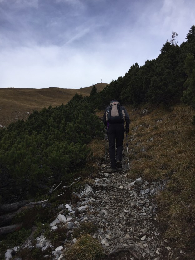Das Wetter ist nicht ganz so, wie man es fürs Bergsteigen haben möchte, aber was solls: Föhn und hohe Wolken…