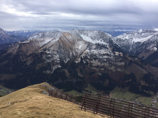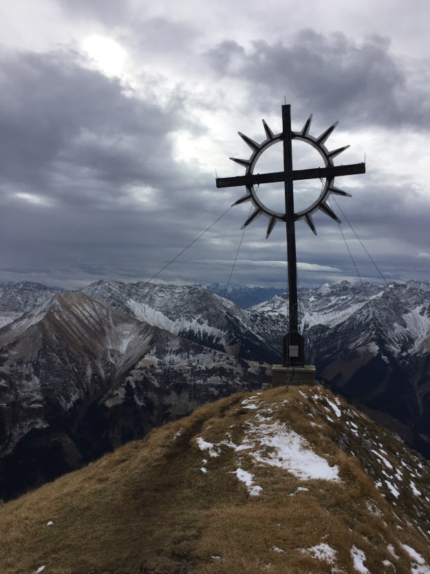 Und dann stehen wir am Gipfelkreuz, mit wunderbarem Ausblick. Getrübt wir die Rundumsicht nur durch den extrem kalten Wind. Im Inntal ist der Föhn wenigstens warm…