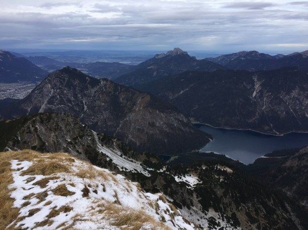 Der Ausblick ist atemberaubend (nicht nur wegen dem Föhn). Unser Hausberg, der Säuling, steht ganz alleine da und ist von dieser Seite wirklich ein beeindruckender Berg. Im Vordergrund sieht man gut den Plansee.