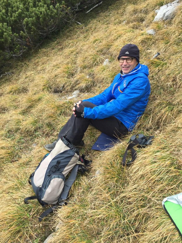 Schon wenige Meter unter dem Gipfel ist es gemütlicher, bald finden wir ein feines Platzerl, wo wir es und gemütlich machen.