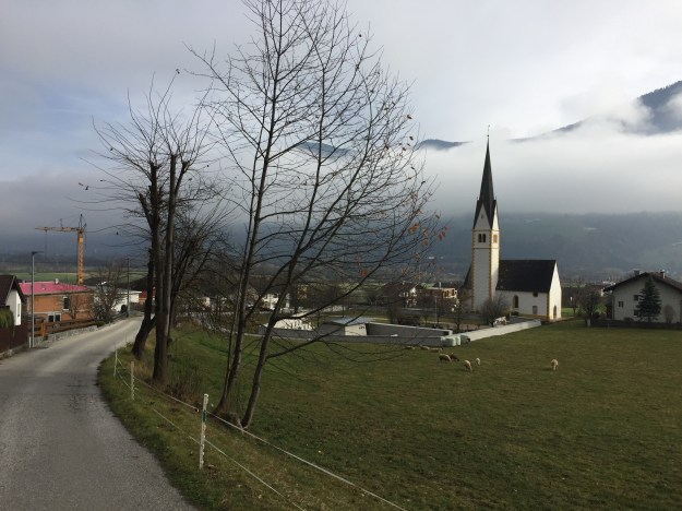 Vom Parkplatz an der alten Pfarrkirche gehen wir los, zuerst hinauf zum Wallfahrtsort „Maria Tax“. Schön steht das kleine Kirchlein über dem Inntal.