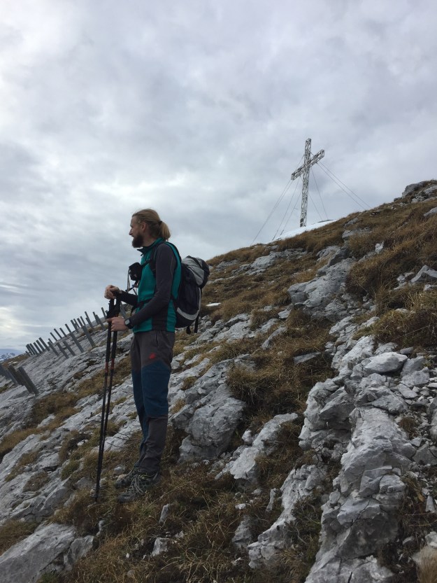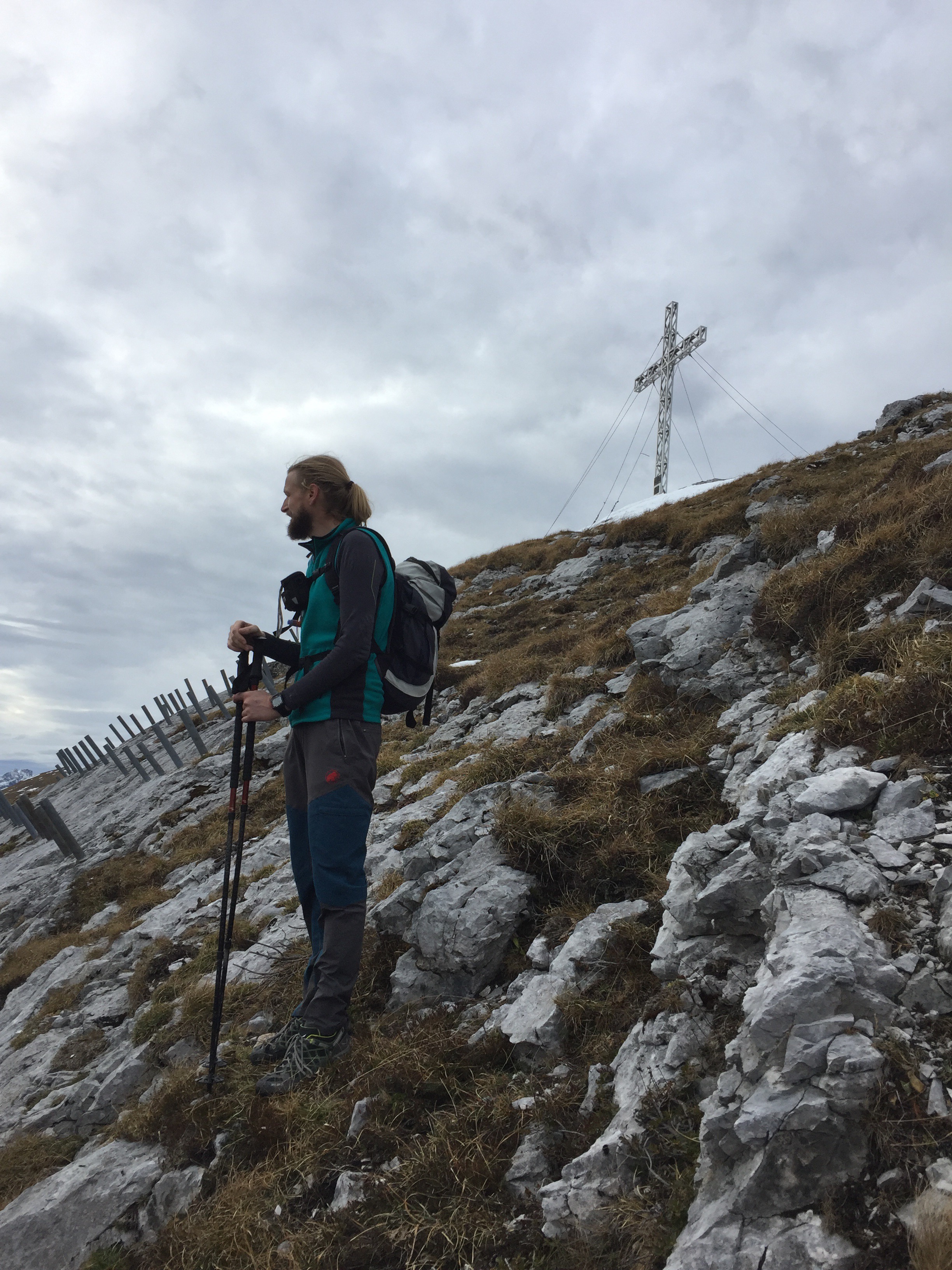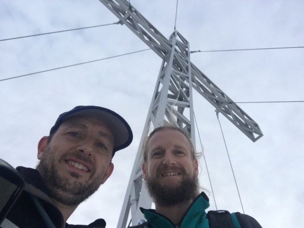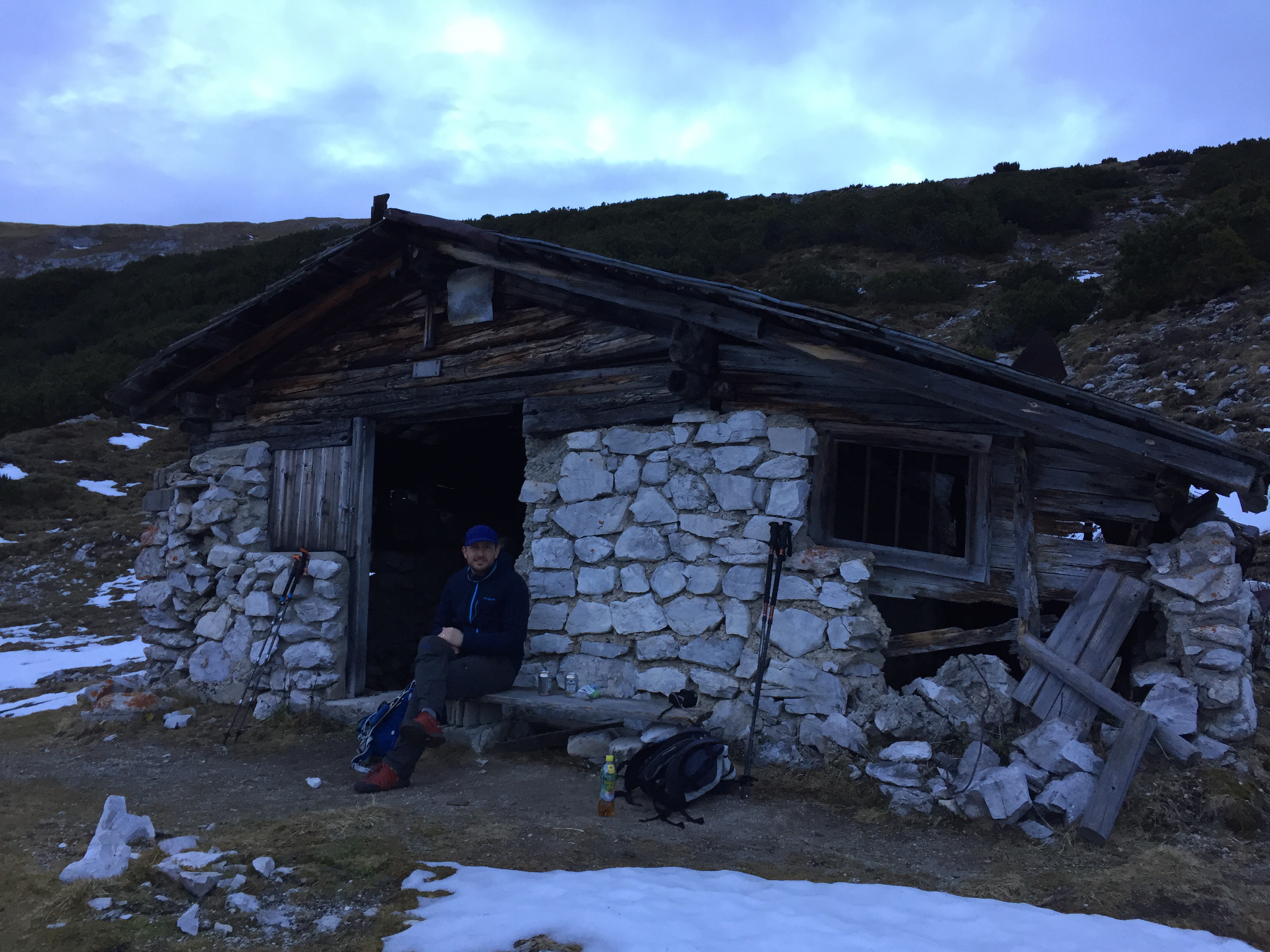 Da es am Gipfel sehr kalt ist, beschließen wir, erst am Hochleger eine Pause zu machen.