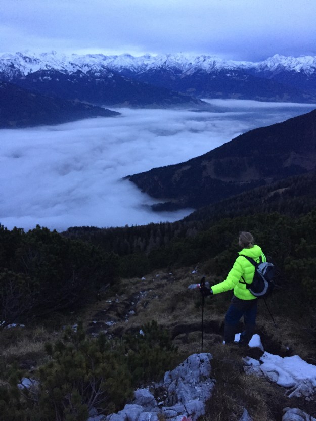 Oben empfängt uns ein sehr kalter Wind und eine grandiose Aussicht auf das Rofan im Norden, im Westen die Ausläufer des Karwendels.