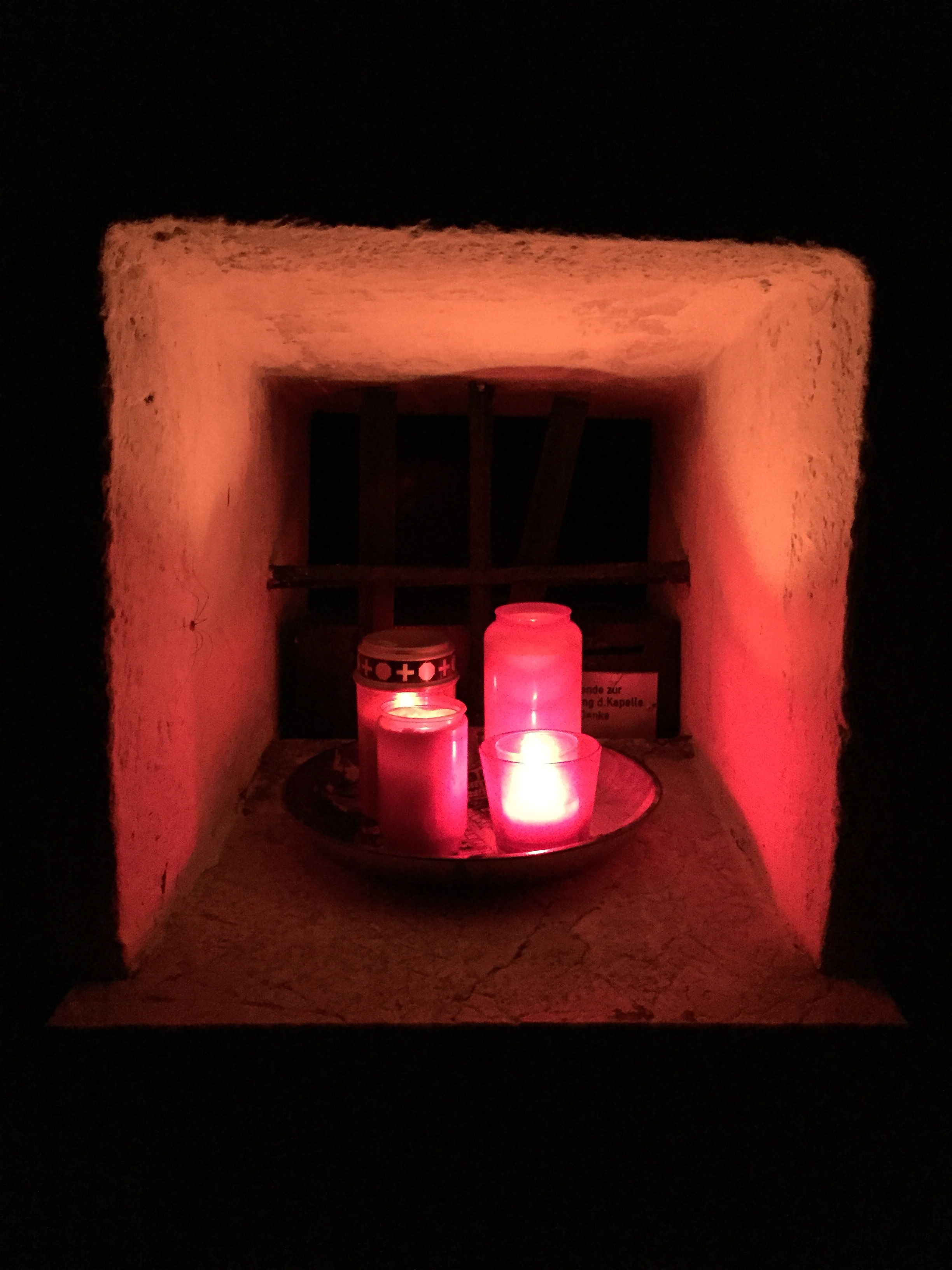 Der Weg ist im Taschenlampenlicht gut ersichtlich, da aber durch die Schneeschmelze der Weg recht aufgeweicht ist, rutschen wir gelegenlich durch die Gegend und müssen über unsere Ungeschicktheit recht lachen. Trotzdem erreichen wir die Wallfahrtskirche „Maria Tax“ nach 1 1/2h ohne Probleme.