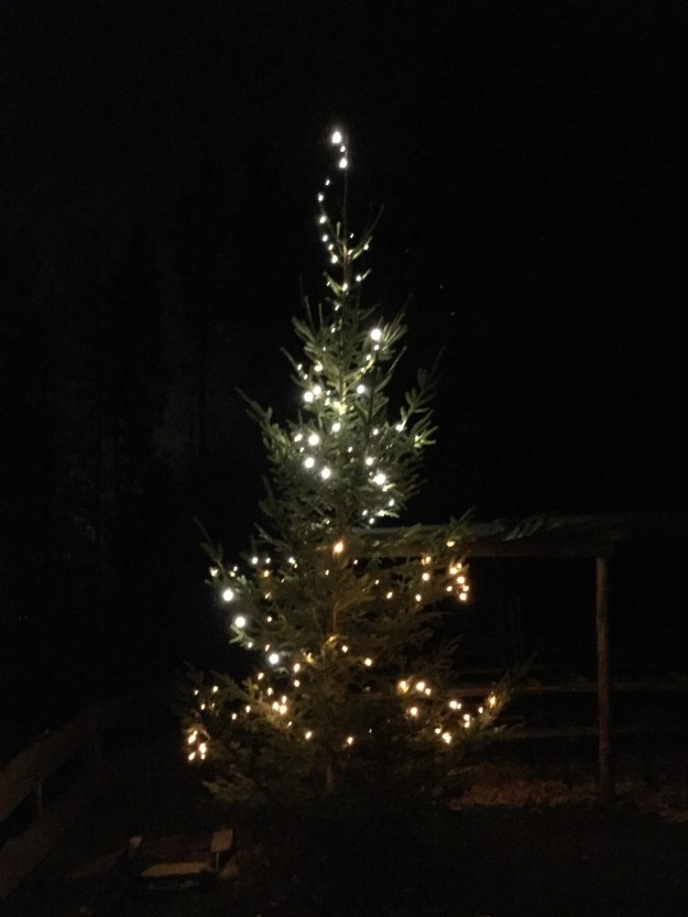 Da es nun schon dunkel ist, leuchtet der Christbaum neben der Kirche in schönstem Lichte.