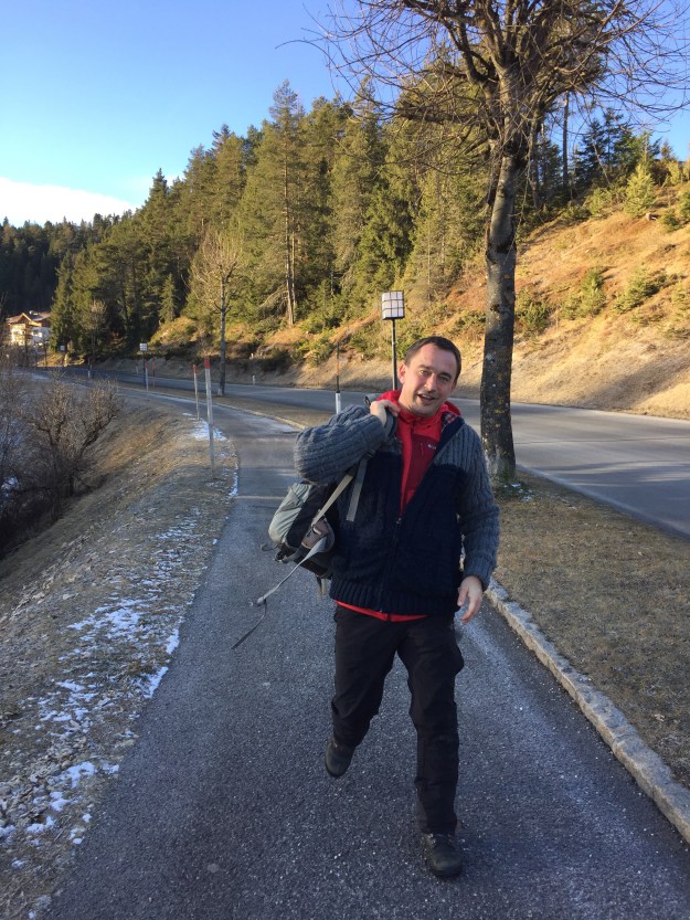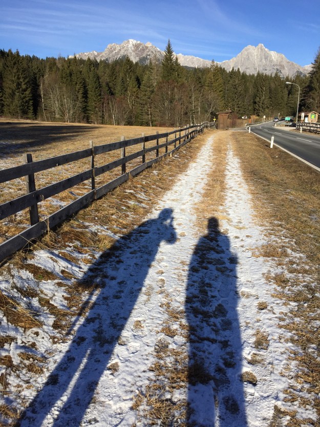Um 8 Uhr treffen wir uns am Bahnhof, noch rasch holen wir eine Wegzehrung beim MPreis, dann setzen wir uns in den Zug hinauf nach Seefeld. Vom Bahnhof aus gehen wir über den Christkindlmarkt in Richtung „Camping Alpin“.