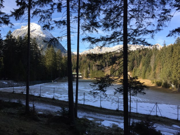 Wieder durch den Wald erreichen wir in leichtem Auf- und Ab dann Seefeld. Ein ernüchterner Anblick sind die beschneiten Pisten inmitten vom Grün, da heuer der Naturschnee noch auf sich warten läßt. Trotzdem sind genug Wintersportler am Weg, auch eine Langlaufloipe aus Kunstschnee breitet sich vor uns aus. Die Piefkesage läßt grüßen…