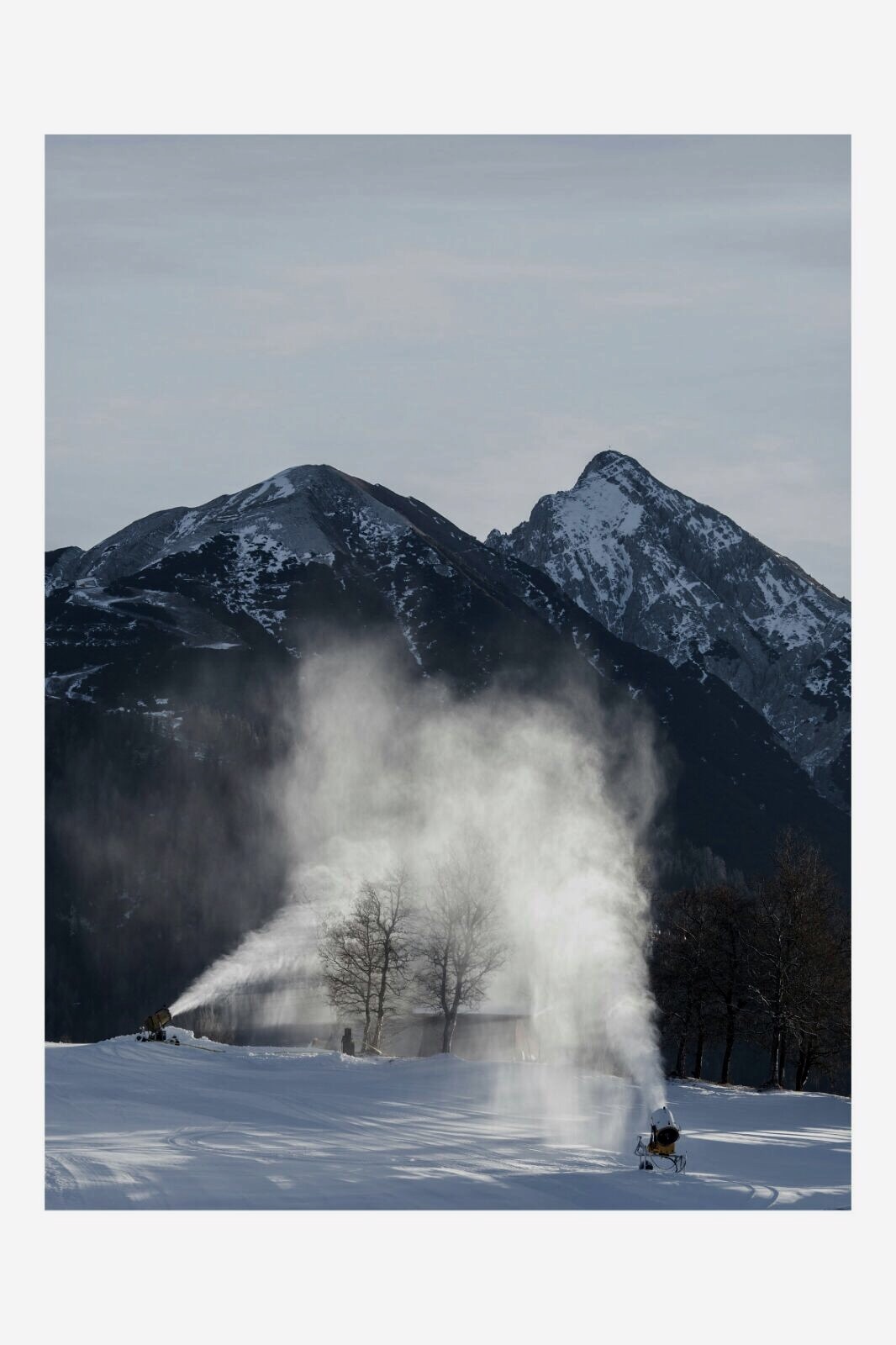 Wieder durch den Wald erreichen wir in leichtem Auf- und Ab dann Seefeld. Ein ernüchterner Anblick sind die beschneiten Pisten inmitten vom Grün, da heuer der Naturschnee noch auf sich warten läßt. Trotzdem sind genug Wintersportler am Weg, auch eine Langlaufloipe aus Kunstschnee breitet sich vor uns aus. Die Piefkesage läßt grüßen…