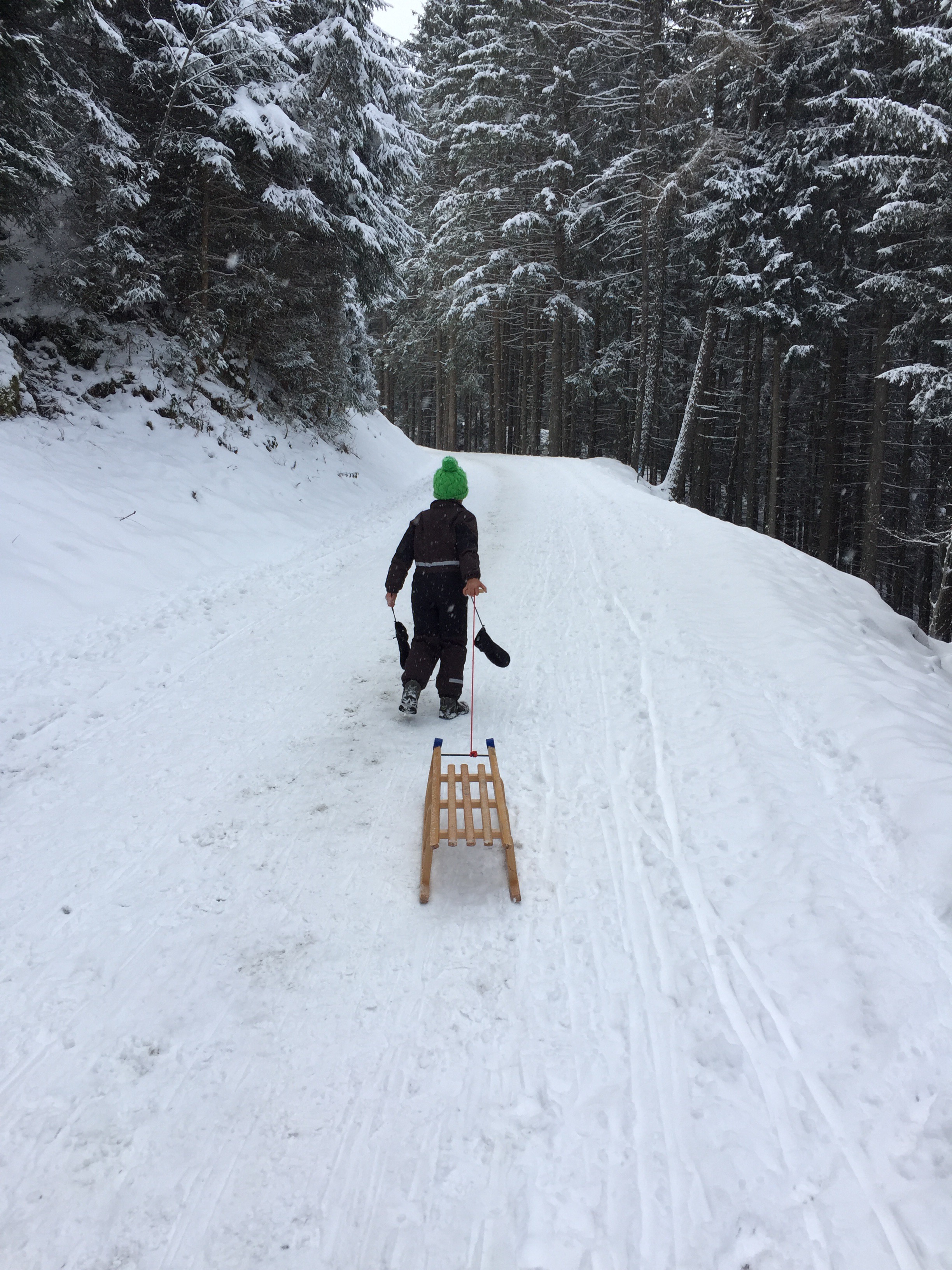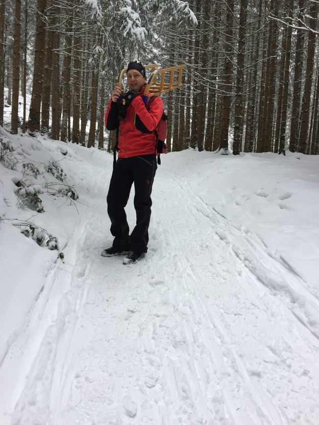 Letu ist gerade mit den Huttlern unterwegs, daher mache ich mich mit Sara auf, eine kleine Rodeltour bei der Rinner Alm zu machen.