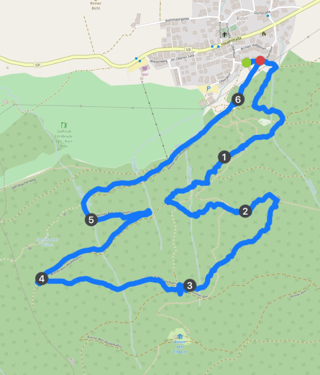 Wir starten in Rinn los, leider müssen wir im Ort parken, da so viele Leute auf dem Weg zur Alm sind, daß wir beim Ausgangspunkt gar keinen Parkplatz bekommen. Die Verlängerung ist aber gar nicht wild, und bald schon steigen wir auf dem Aufstiegsweg hinauf.