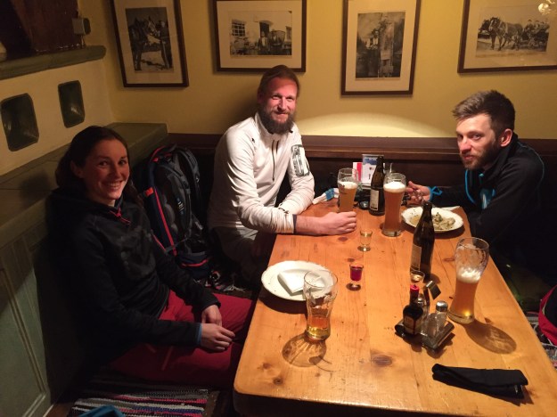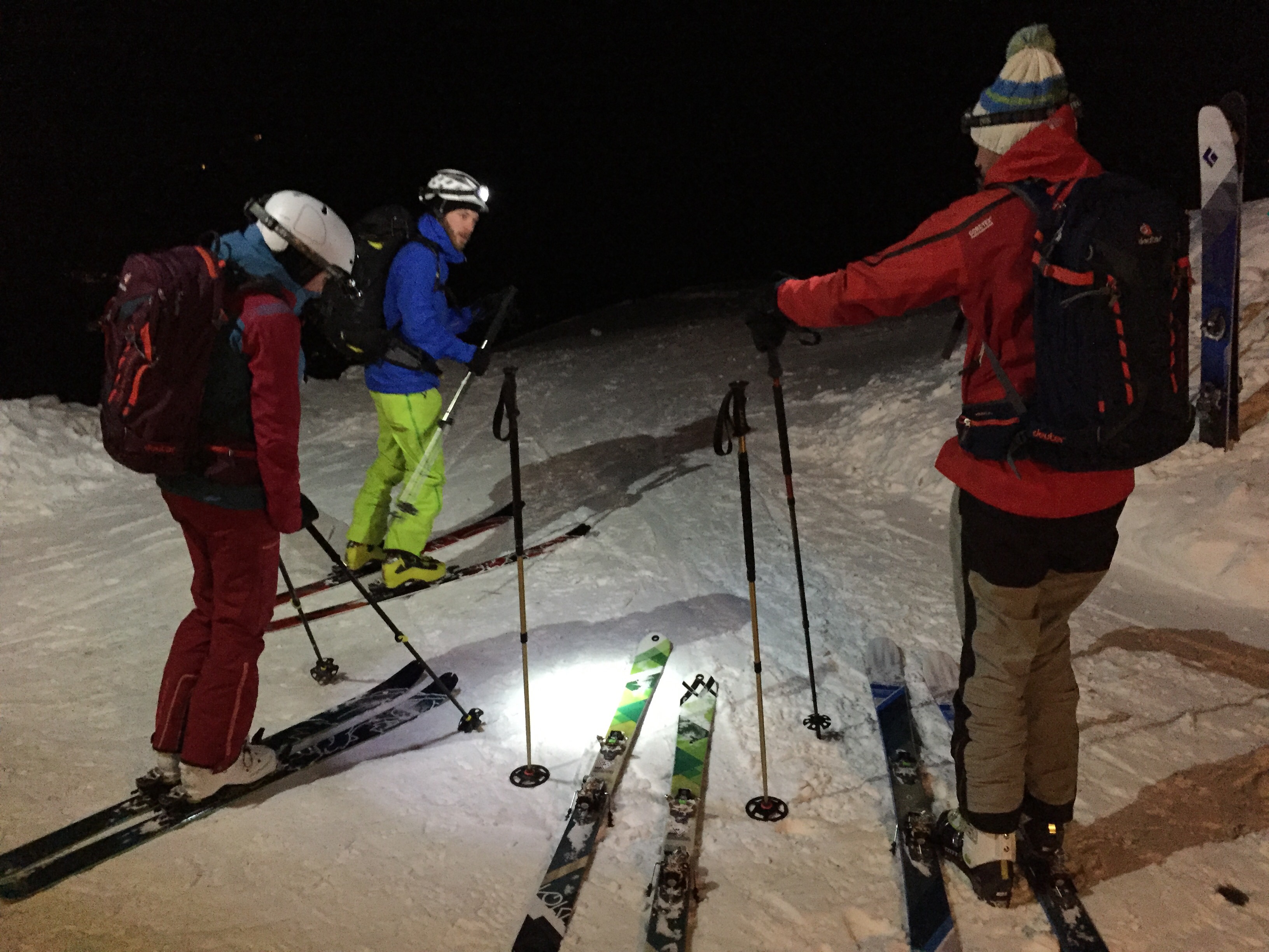 Die Felle sind rasch verstaut und wir sind auch schon bald in der urigen Hütte. Ein kühles Weizen löscht den Durst, und wir reden ein wenig über Gott und die Welt. Dann machen wir uns an die Abfahrt, die dank guter Taschenlampe auch wunderbar von statten geht.