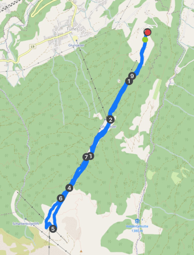 Wir gehen über die FIS-Standardabfahrt immer parallel zum Schlepplift hinauf, bis wir die Bergstation von eben diesem Lift erreichen. Ein Stück weiter geht es über einen Ziehweg, dann erreichen wir die Abfahrt zur Tulfeinalm. Unser erster Plan, war noch auf den Schartenkogel zu gehen, aber wir beschließen, es für heute zu lassen, denn es ist schon 21:00 Uhr.