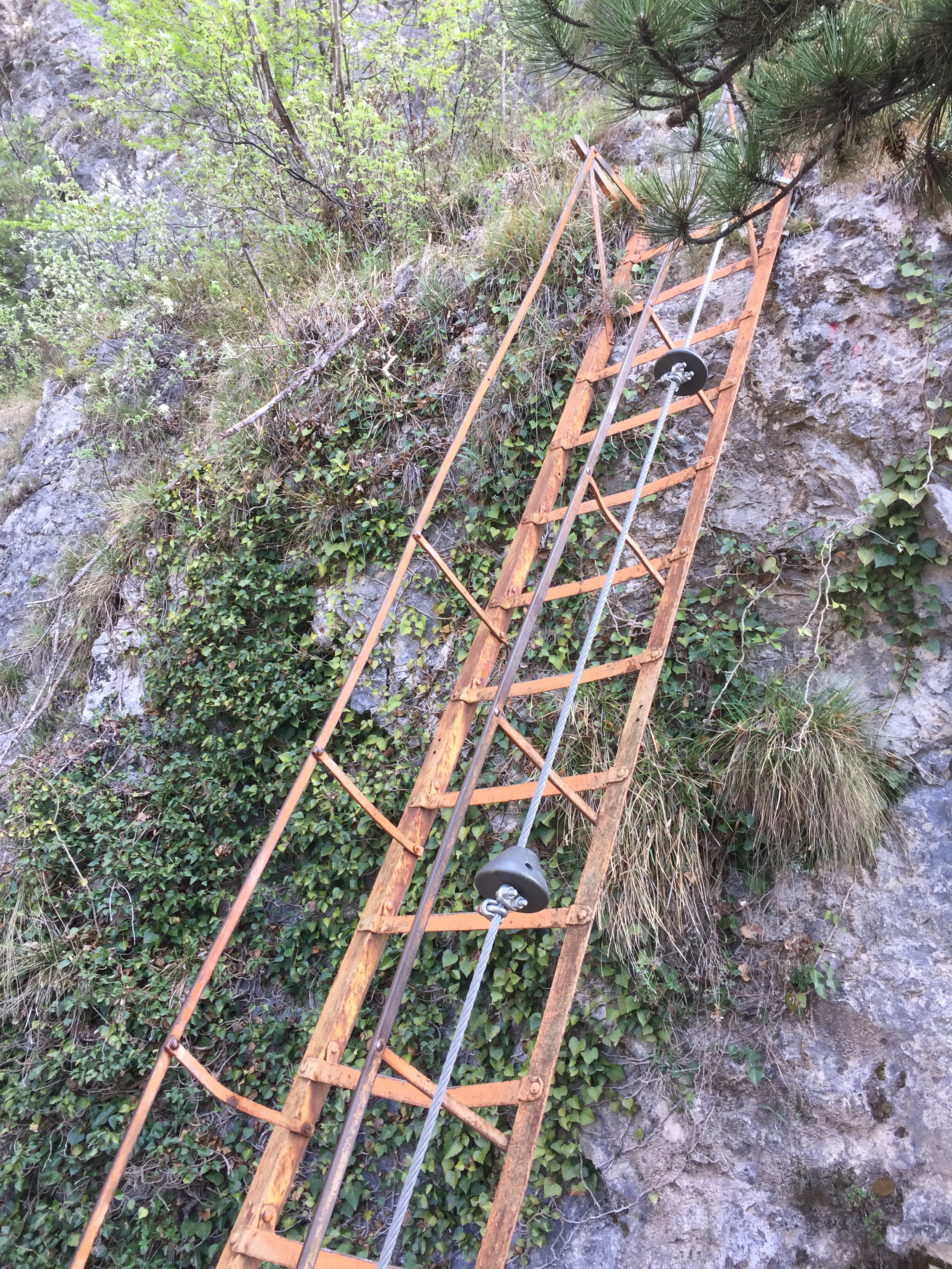 Der erste Teil des Klettersteigs fängt gleich gut mit einer Leiterkombination an, die gleich als „Aufnahmeprüfung“ dient. Dani ist schon länger keinen Klettersteig gegangen, daher ist das super zum Probieren.