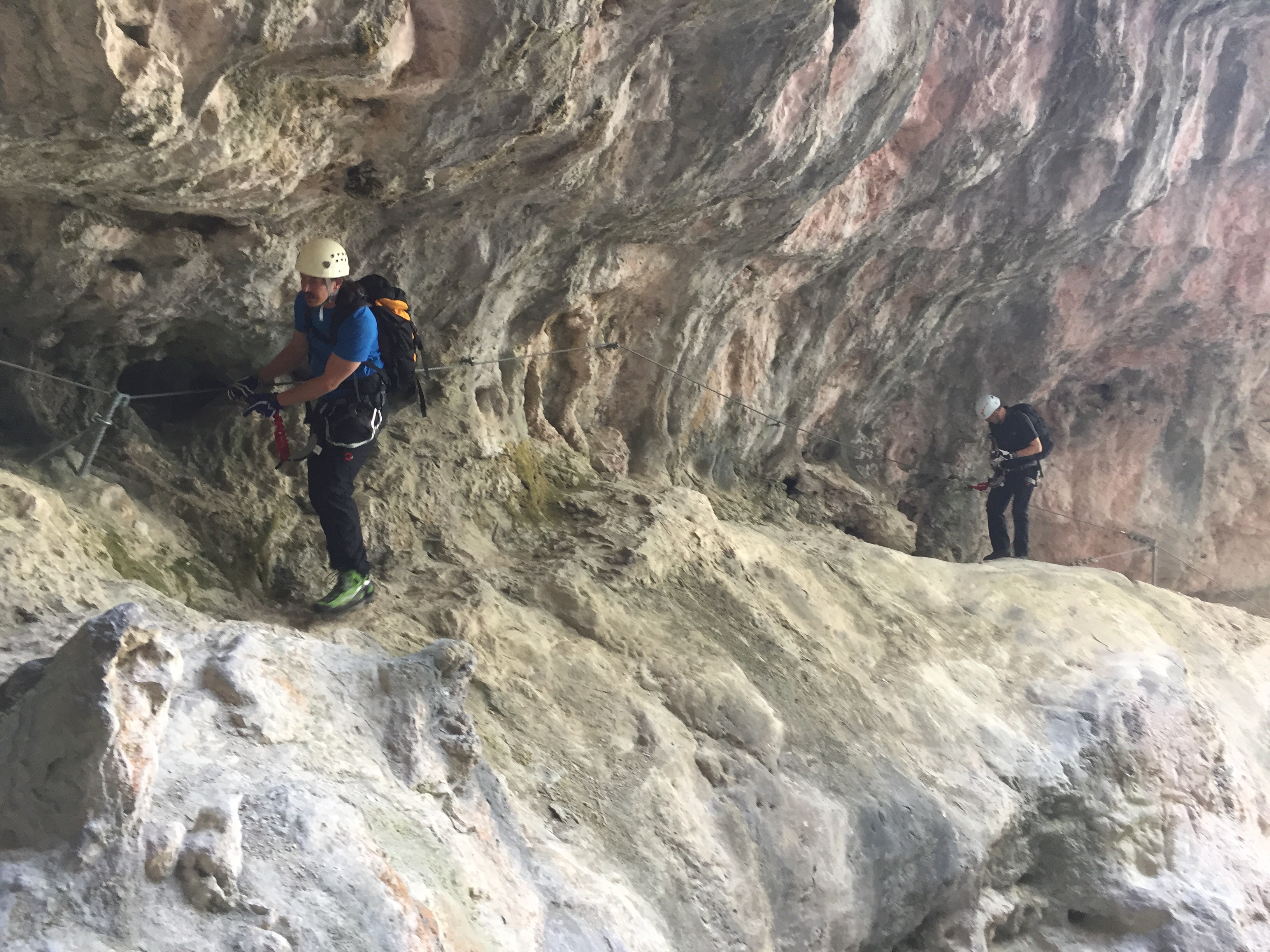 Ein Riss, der mit einer Leiter überwunden wird. Anschließend kommt die für mich schönste Stelle, ein überdachtes Band, bei dem wir uns durchbücken müssen.