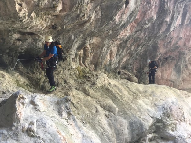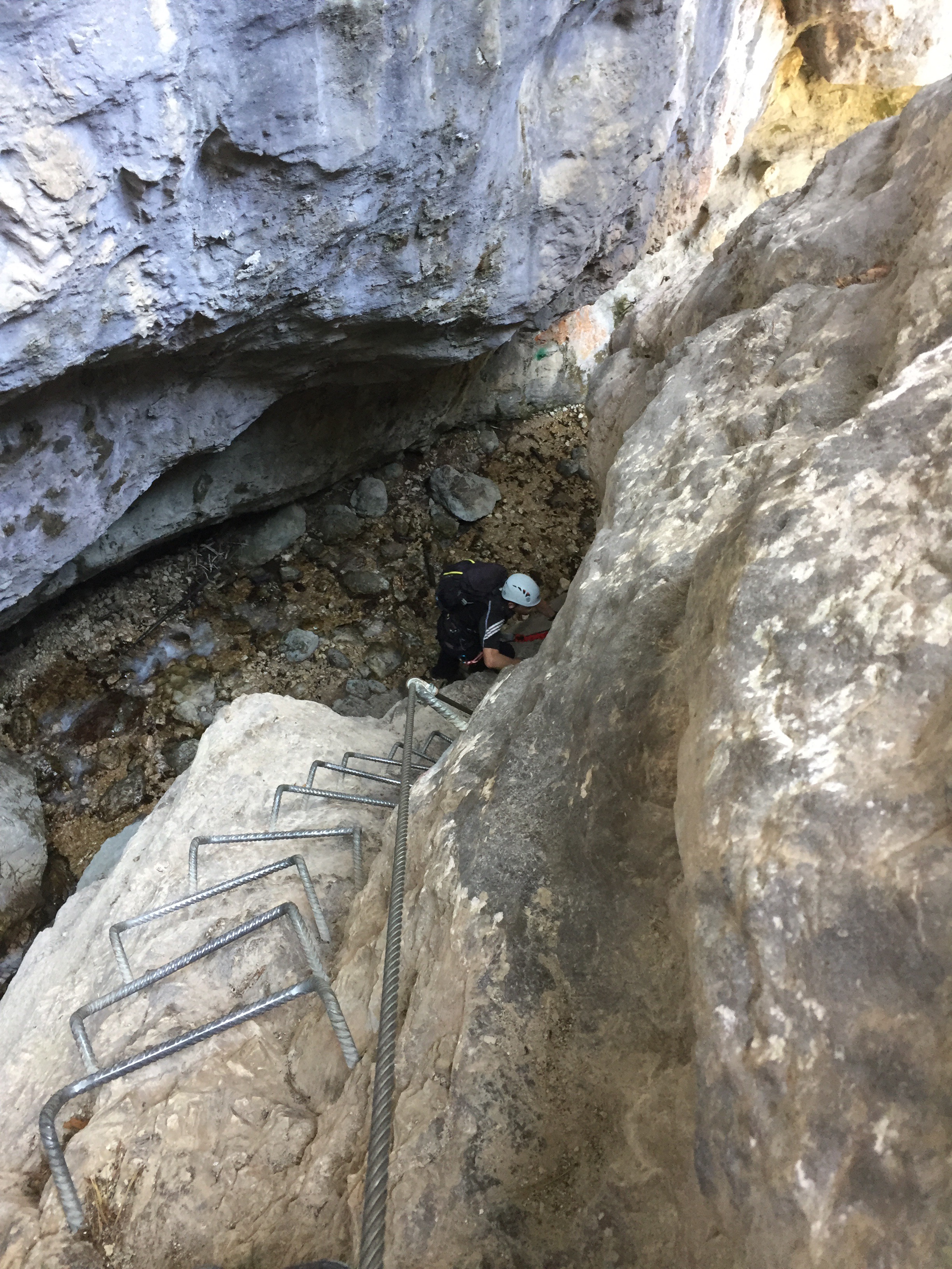 Die nächste spannende Stelle lässt nicht lange auf sich warten, damit wir nicht vergessen, dass das hier doch ein Klettersteig ist.