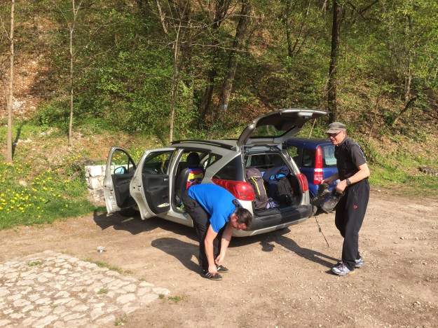Wir erreichen nach nicht ganz 2 h unser erstes Ziel, den Parkplatz vom Klettersteig „Burrone Giovanelli“. Der Verkehr war super, nirgends eine Verzögerung.