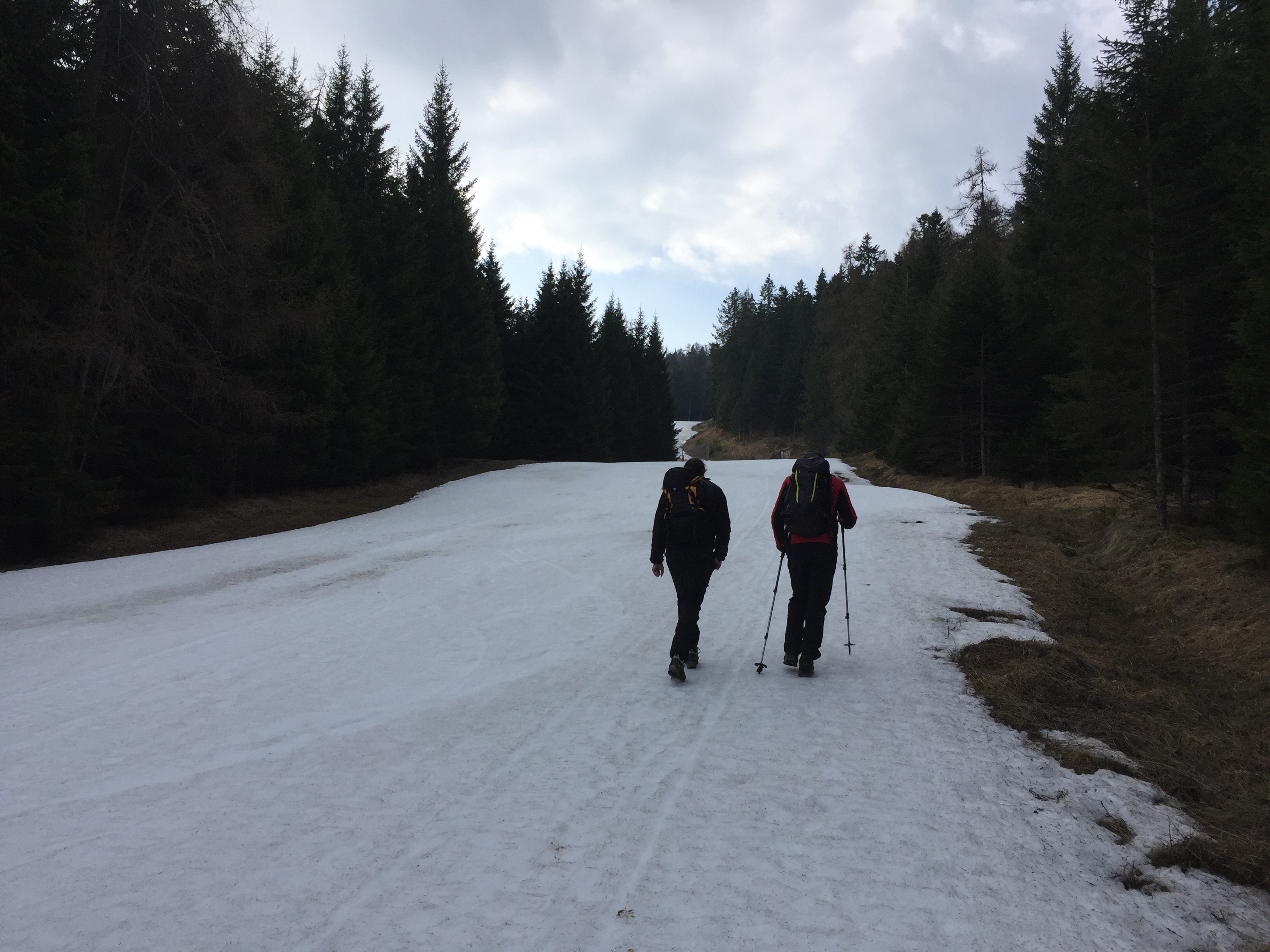 Weiter oben zweigen wir dann auf einen Forstweg ab. Sobald wir das kompaktierte weiße Wunder hinter uns lassen, fühlen wir uns wieder wie im Frühjahr. Kein Schnee weit und breit, zumindest nicht in erwähnenswerten Mengen.