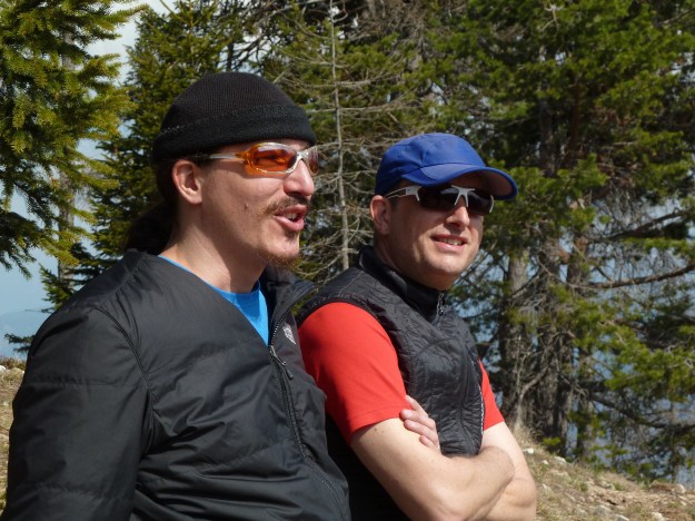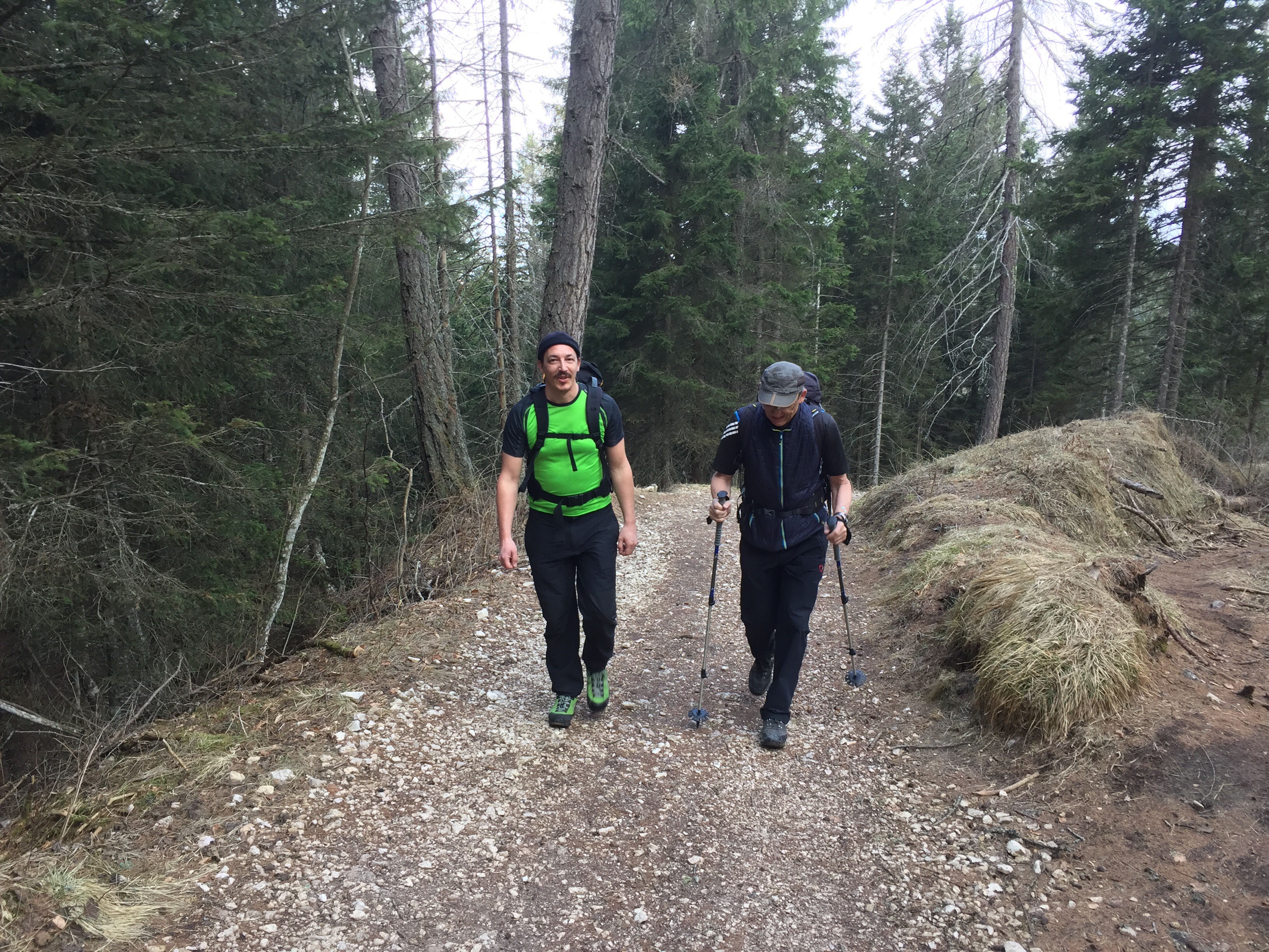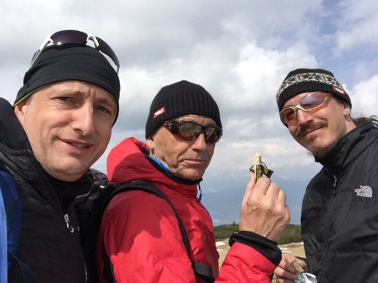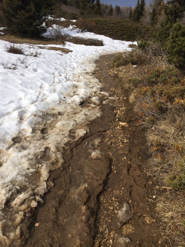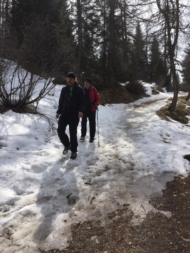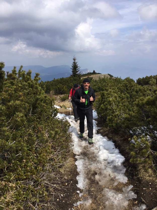 Im Aufstieg sind wir meistens auf der Südseite des Bergmassivs gegangen, nun müssen wir auf die Nordseite. Hier liegt bedeutend mehr Schnee, der Weg ist jedoch problemlos machbar, wenn auch manchmal ein wenig „gatschig“.