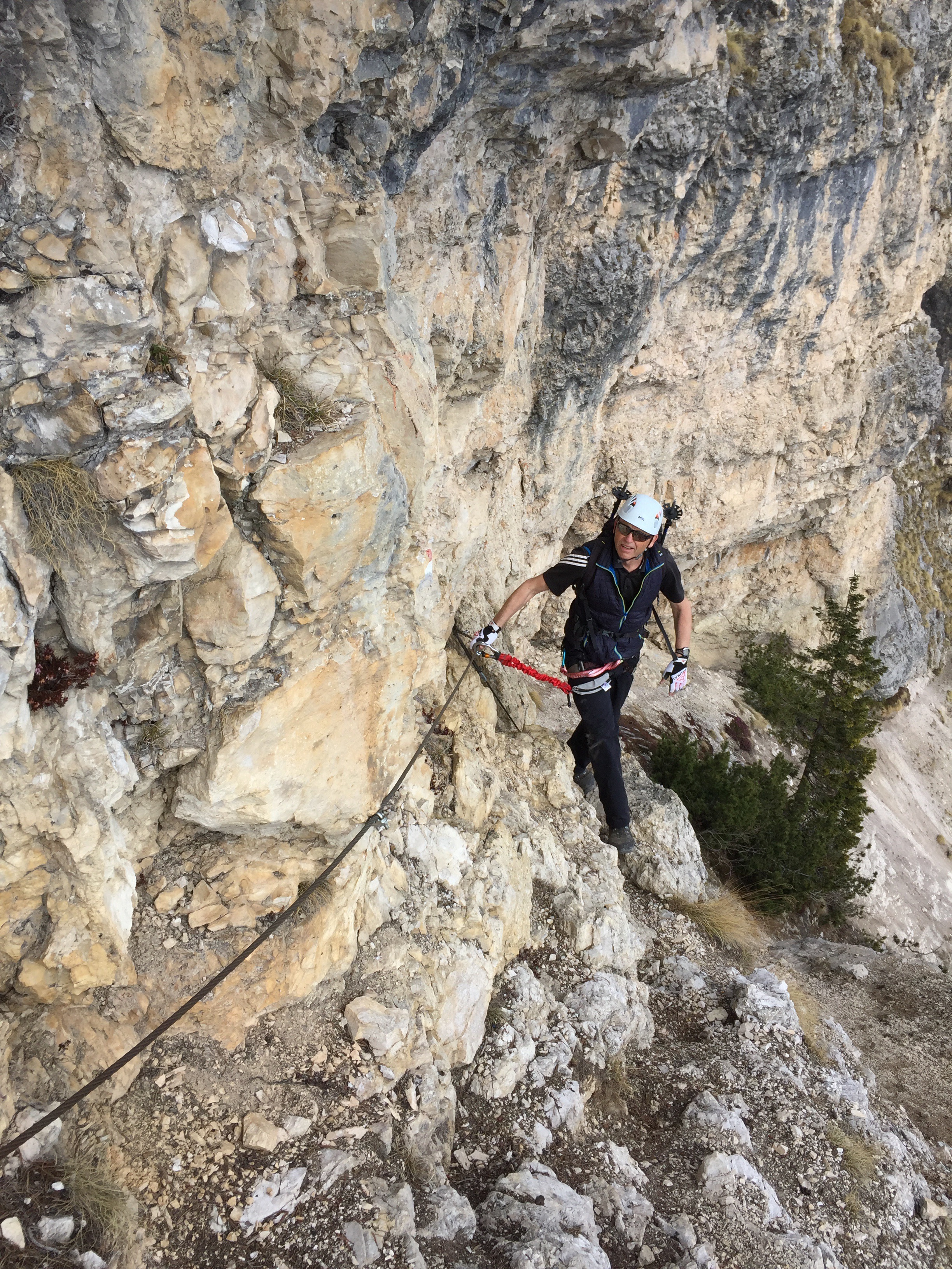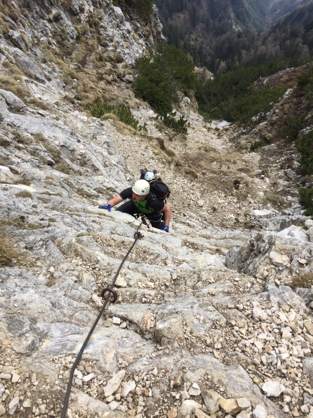 Von dort gehen wir direkt zum Einstieg des Klettersteigs auf den Roen. Unter der Felswand ziehen wir unser Kletterzeug an, dann steigen wir weiter auf. Der Weg ist nicht schwer, aber an manchen Stellen doch ausgesetzt, da ist das Seil zumindest zum Halten sehr fein.