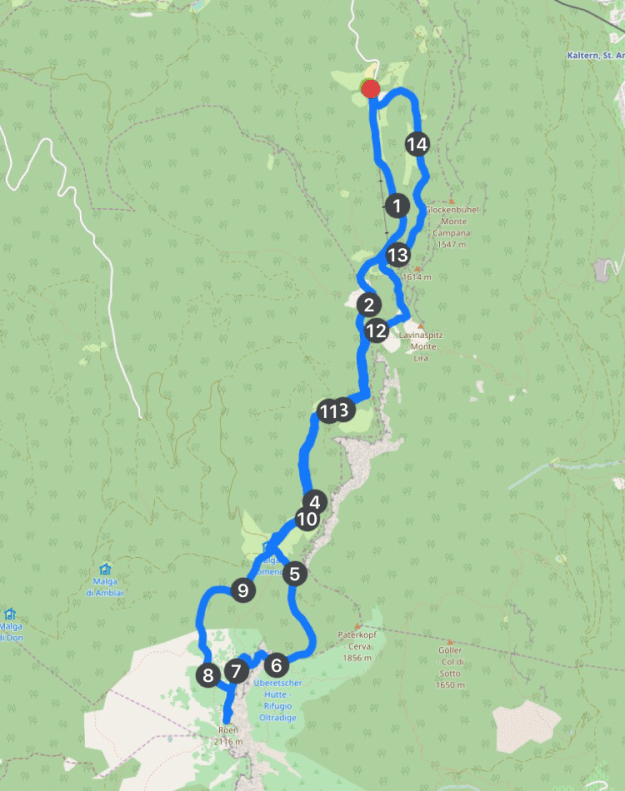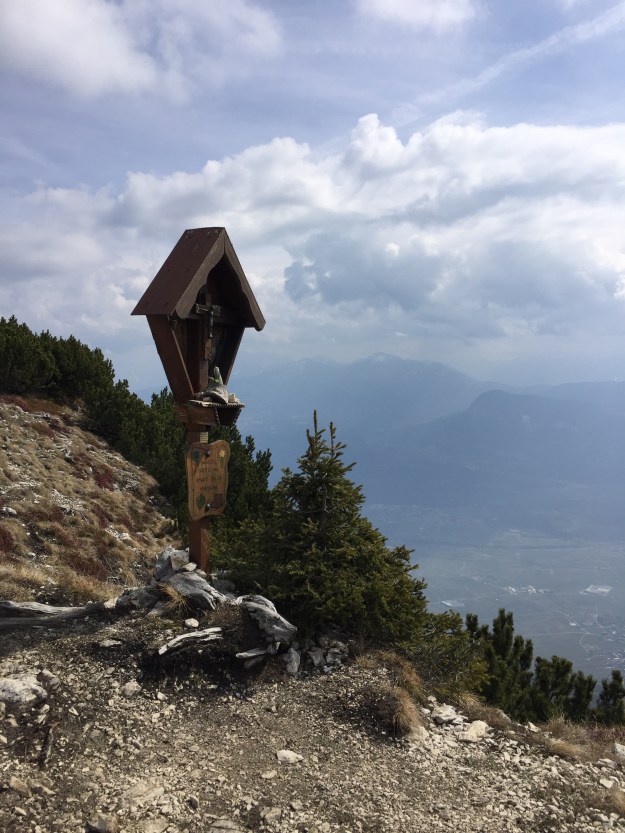 Zuerst müssen wir von Tramin nach Kaltern, dort zweigt die Passstraße zum Mendel ab, eine bekannte Motorradstrecke, wie wir auf feststellen. Direkt beim Pass biegen wir nochmals nach Links ab, bis wir die Talstation des kleinen Skigebietes erreichen. Dort stellen wir das Auto ab und machen uns per Pedes weiter auf.