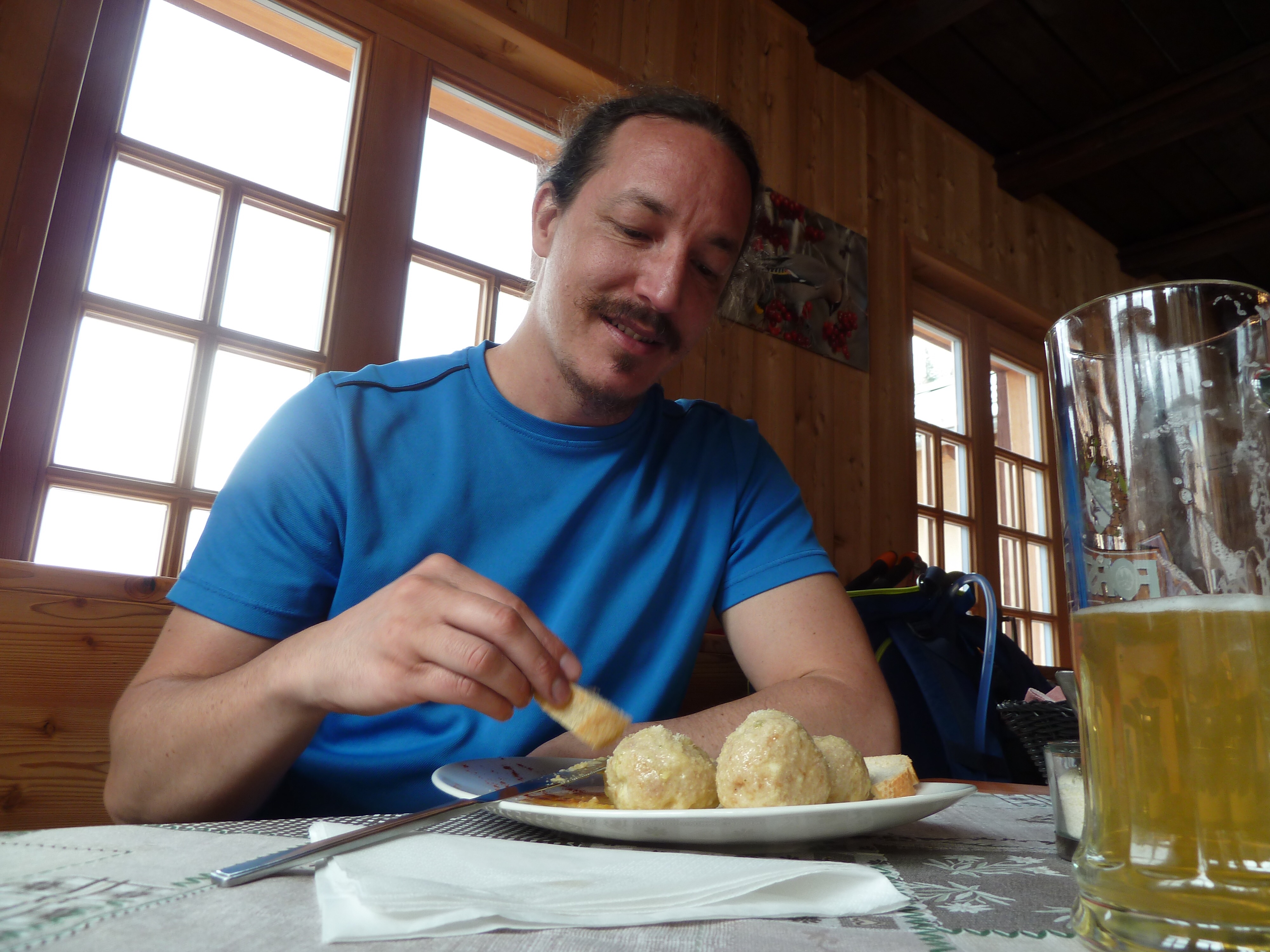 Auf der „Malga“ machen wir Pause, jeder gönnt sich eine Kleinigkeit zum naschen, Dani nimmt Käsknödel, Papa und ich bevorzugen was Süßes… Apfelstrudel.