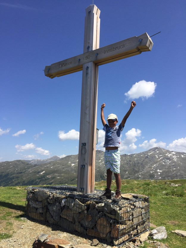 Es ist zwar heiß, aber es geht eine feine Brise, die den Aufstieg angenehm macht. Wir machen schnell Höhe und schon nach 30 Minuten stehen wir oben am Gipfelkreuz. Das ging ja schnell.