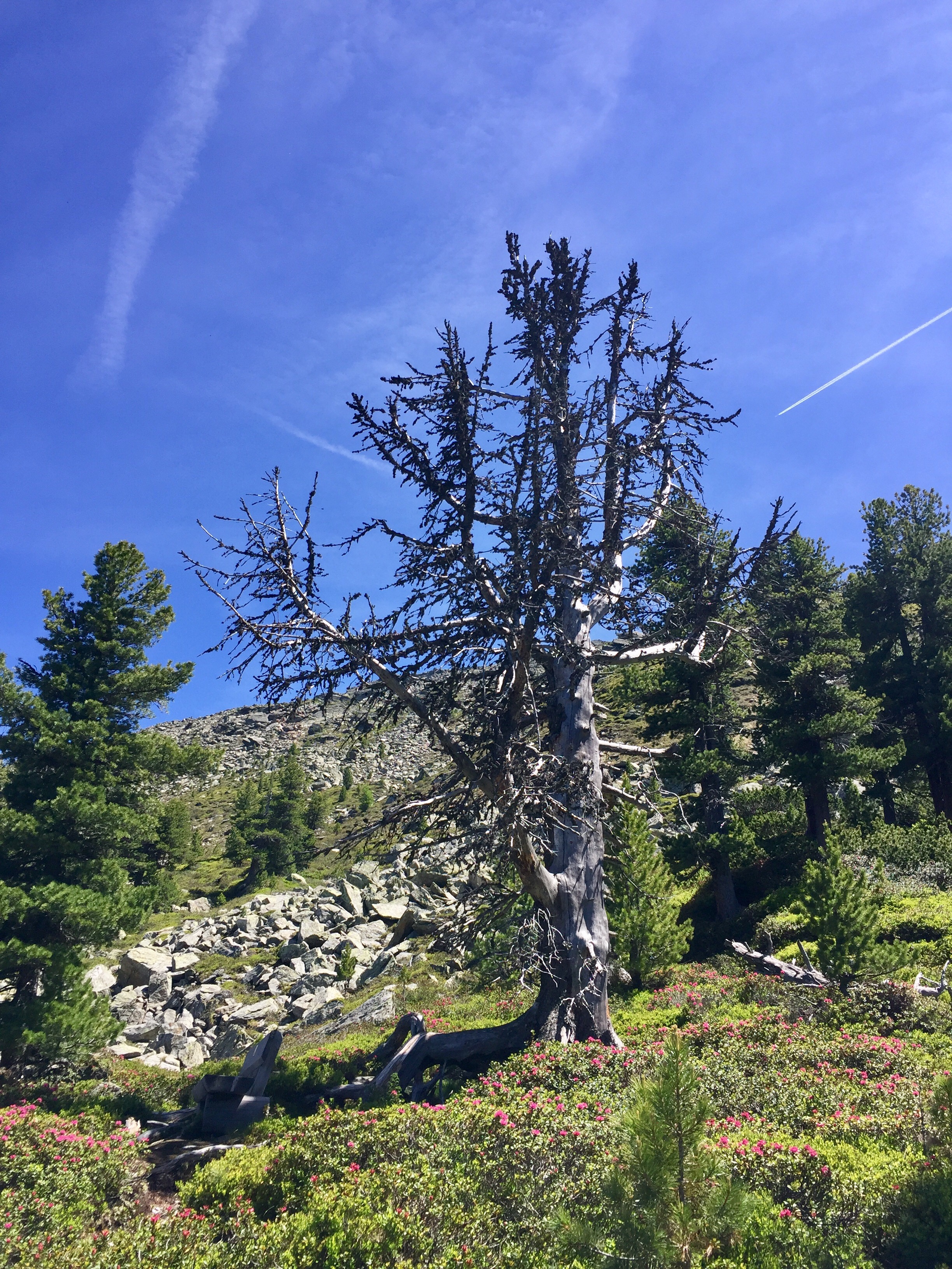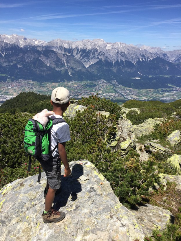 Durch einen Latschen- bzw. Zuntergrütel müssen wir hinuntersteigen, Richtung Steig. Letu meint immer wieder: „Papa, wie unendlich weit sind die Latschen noch?“. Doch alles hat irgendwann sein Ende, schlußendlich stehen wir weider auf dem Zirbenweg.