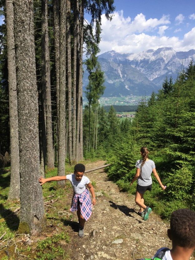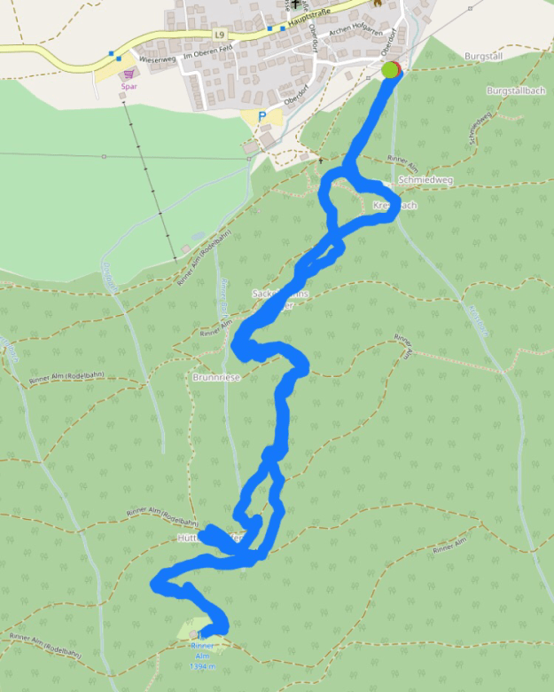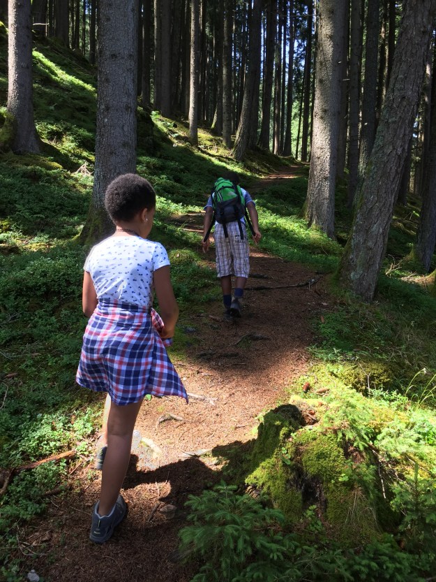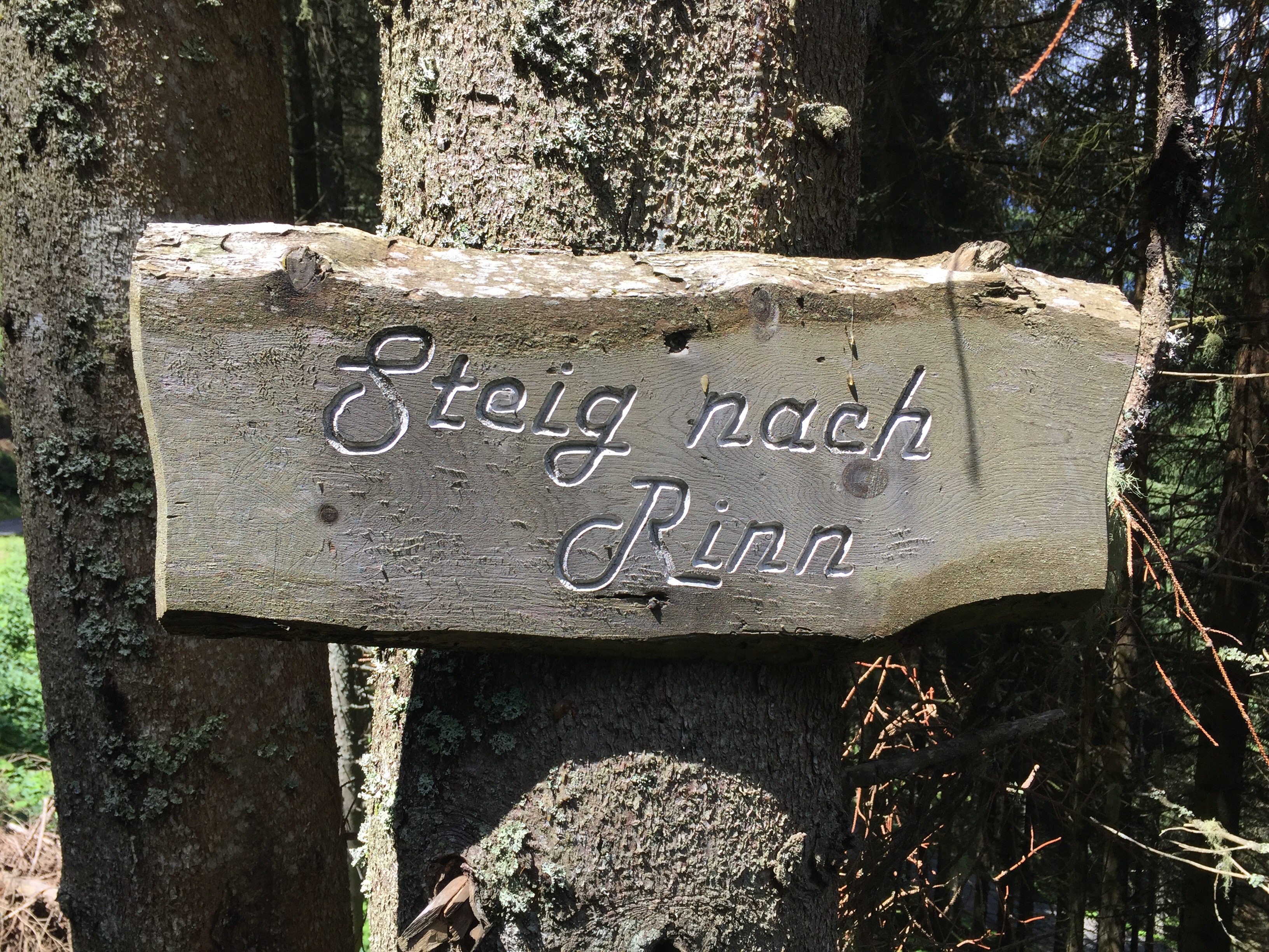 Ich wollte heute mit den Kindern eigentlich recht hoch hinaus, doch nun nehmen wir das Ersatzprogramm, das nicht minder schön ist. Wir wandern durch den Wald hinauf zur Rinner Alm.