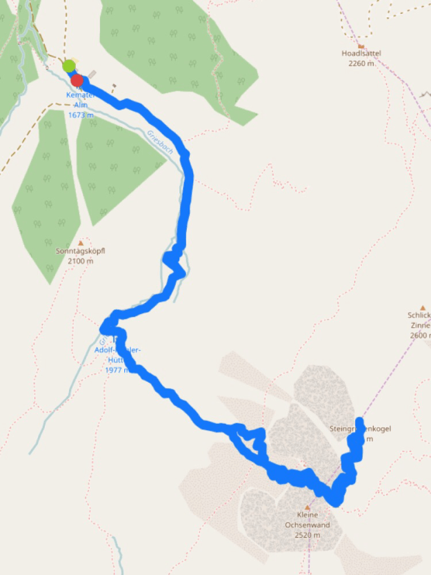 Von der Kemater Alm gehen wir hinauf zum Adolf-Pichler-Haus. Dort sitzen ein paar Wanderer und schauen uns verwundert an. „Wo geht ihr noch hin, um diese Uhrzeit“, werden wir gefragt. Nachdem Alfons unser Ziel bekannt gibt, lösen wir staunen aus. Na, denen werden wir´s schon zeigen…