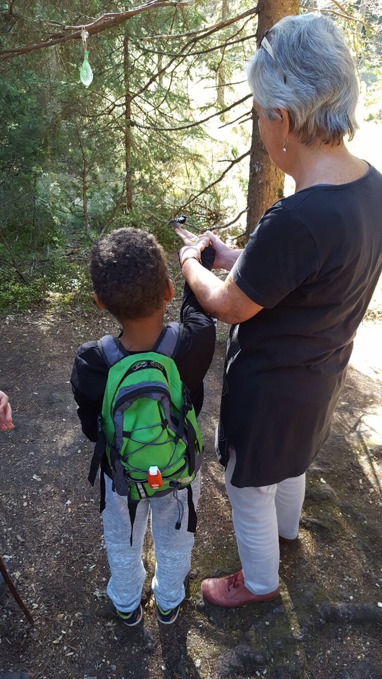 Ein Stückchen weiter können wir noch ein paar Meisen füttern, die so zahm sind, dass sie sogar auf die Hände der Kinder fliegen. Ein tolles Erlebnis.