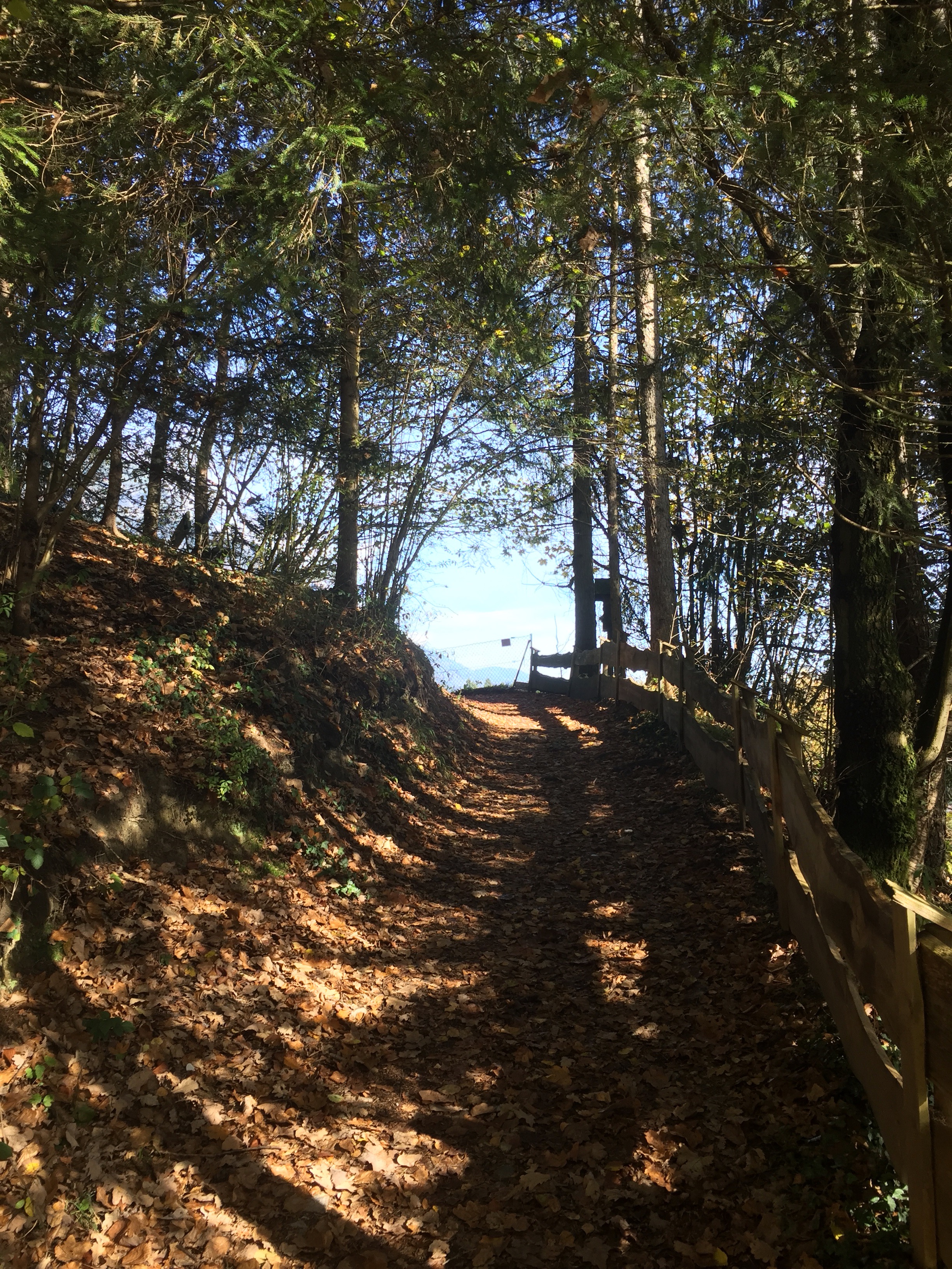 Wir starten beim Wanderparkplatz in Thaur, von dort geht es am Waldrand entlang Richtung Arzl.