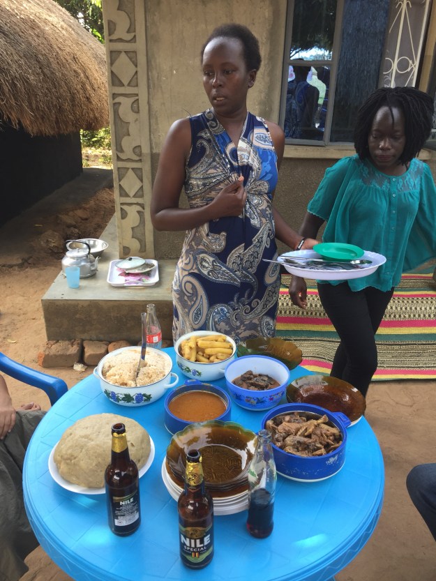 Der Gockelhahn muss aber erst noch eingefangen werden, daher besuchen wir gleich in der Nähe Tutu, eine Freundin von Lucy. Wir bekommen ein Bier und Soda’s serviert, dann steht auch hier ein volles Essen auf dem Tisch.