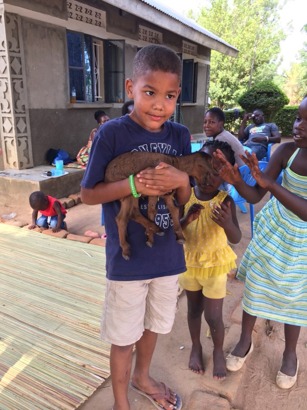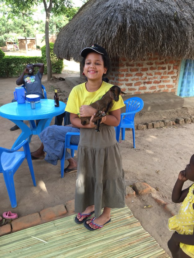 Da auf einem ugandischen Bauernhof alle Tiere frei rumlaufen, haben unsere Kinder schon bald die Geißlein entdeckt. Welch ein Hallo.
