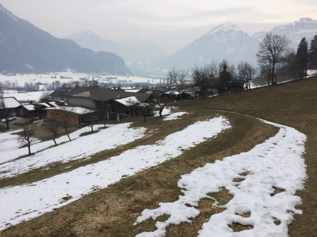 Dann geht es durch ein paar schöne Bauernwiesen, jetzt noch mit Schnee bedeckt und vorbei an großen Bauernhöfen zum Waldrand. Auch hier finden wir einige Dosen.