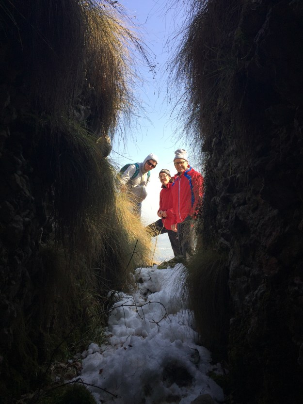 Ein leichter, kalter Wind stört uns dann doch und wir beschließen, wieder abzusteigen. Kurz unter dem Gipfel schauen wir uns noch eine Kaverne an, deren Zweck sich uns jedoch nicht erschließt. Papa, unser Geologe, findet das Plätzchen aber doch sehr interessant und erklärt uns den Aufbau der Gesteinsschichten.
