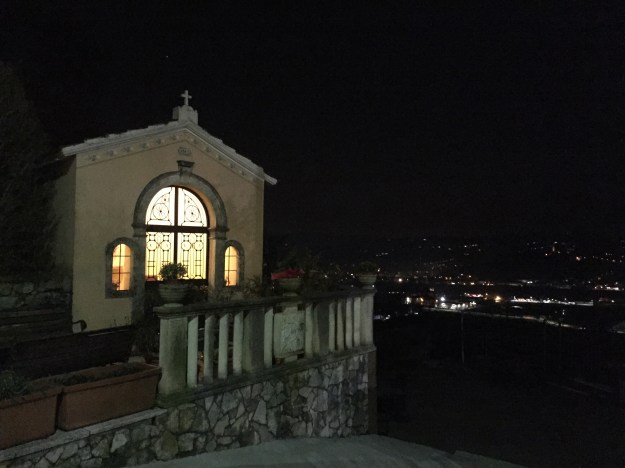 Ehemals eine Seidenraupenzucht, wurde dieses Gebäude vom jetzigen Besitzer sehr stylisch her- und eingerichtet. Wir fühlen uns sogleich wohl, die Zimmeraufteilung ist auch gleich erledigt. Auf die Frage, wo wir noch gut essen können, bekommen wir eine Empfehlung für ein feines Restaurant in der Nähe. Ein Anruf zur Reservierung wird getätigt, dann brechen wir auf. Dank der guten Wegbeschreibung erreichen wir die „Trattoria Capitello Della Cocca“ schon sehr bald. Hoch über dem Tal gelegen, ist die Aussicht auch sehr schön…