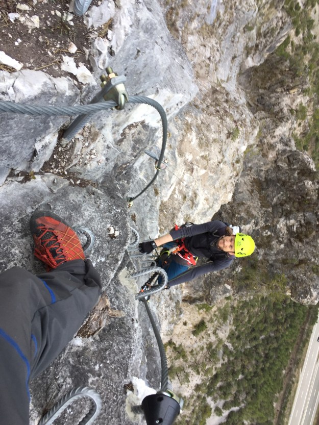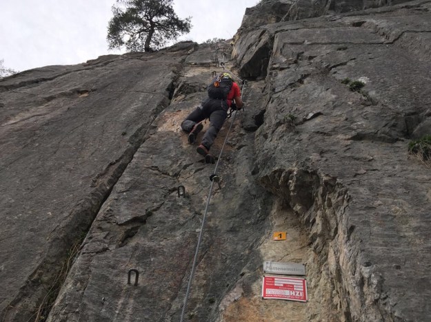 Bald schon stehen wir vor der Einstiegswand und ziehen uns das Klettersteigzeug an. Dann gehts los.