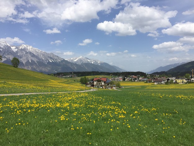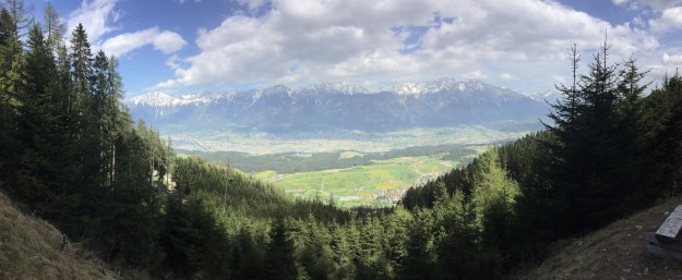 Ich wandere an der Alm vorbei, es sind trotzdem einige Leute auch schon per Pedes oder mit dem Rad hier raufgekommen. Ab der Alm wird es viel ruhiger. Der Weg „gehört“ mir alleine. Die Aussicht auf das Inntal wird immer besser…