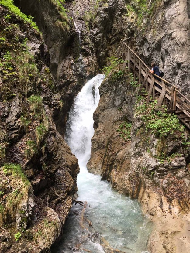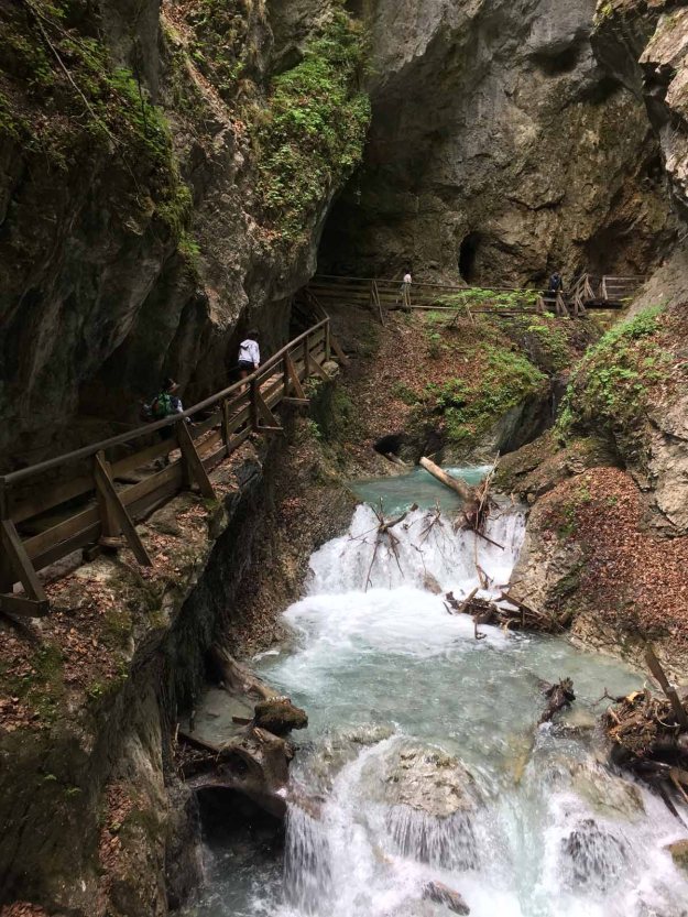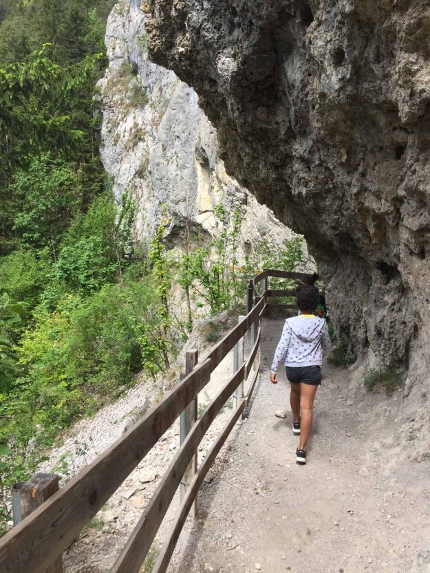 Von Aldrans aus fahren wir erst mit dem Bus nach Innsbruck, dann mit dem Zug weiter nach Stans. Hier starten wir durchs Dorf, hinauf zur Mautstelle am Eingang der Schlucht. €6.50 (alle zusammen) müssen wir zahlen, das lasse ich mir gerne einleuchten. Irgendwer muss ja auch den Steig erhalten. Und es gibt sie doch noch, die Moderaten Preise…