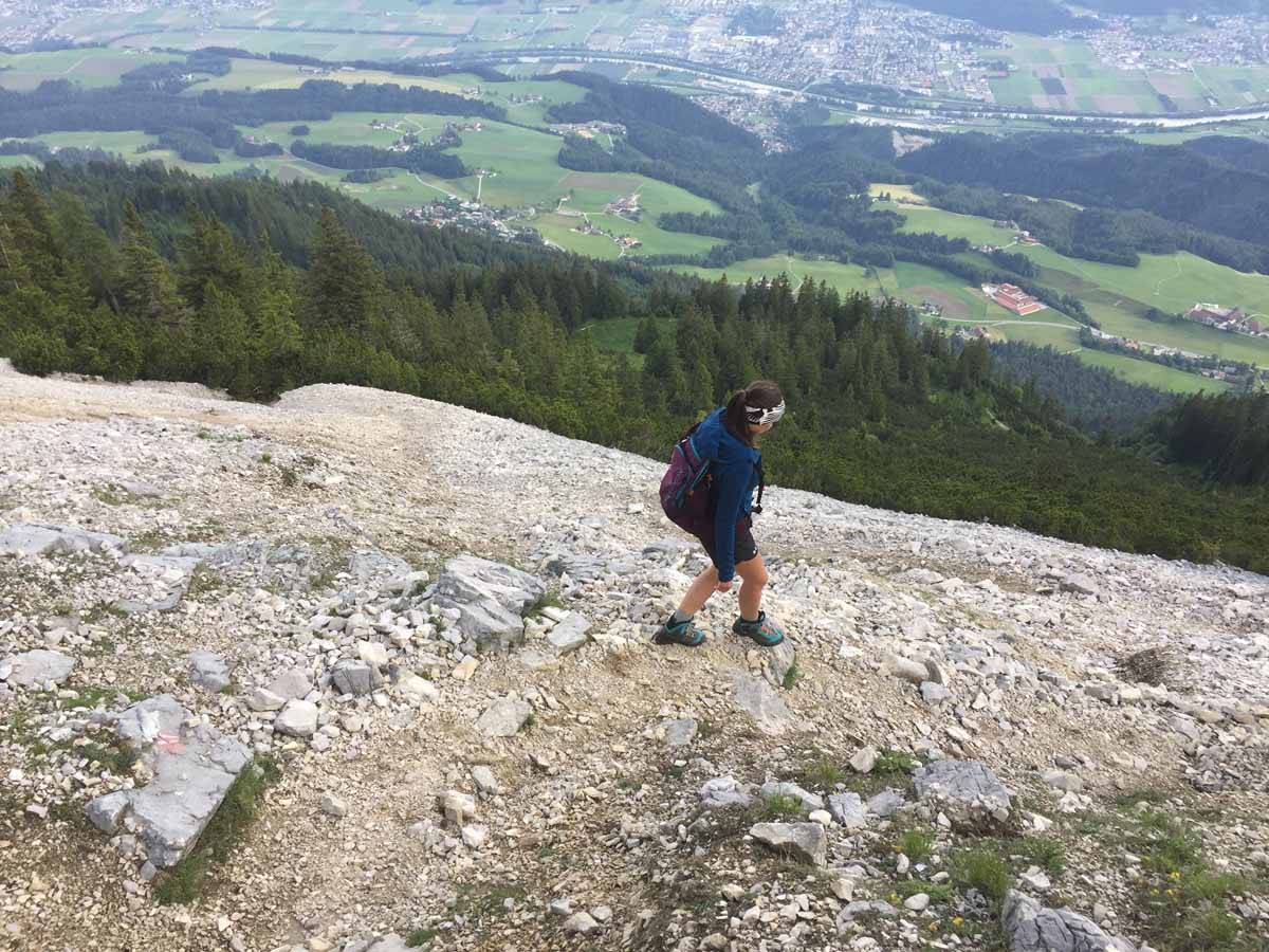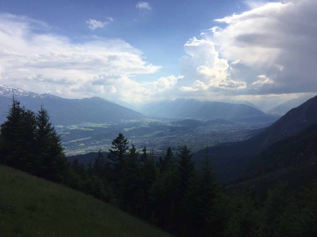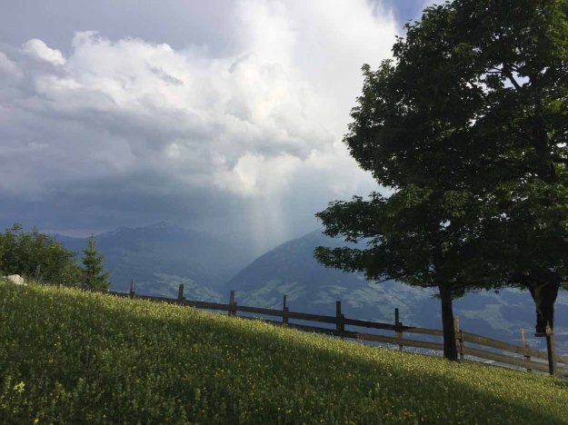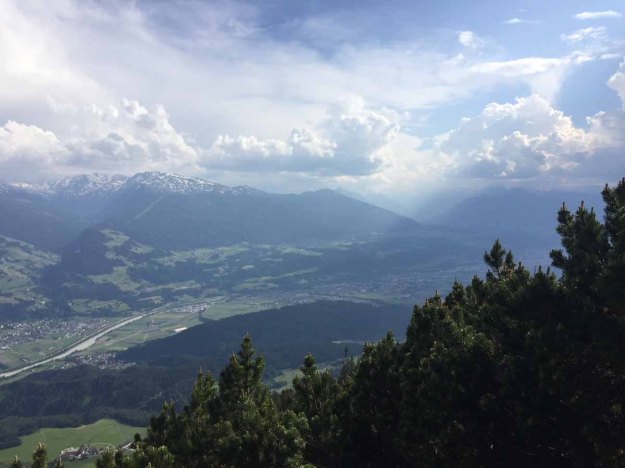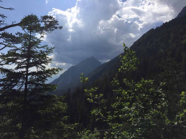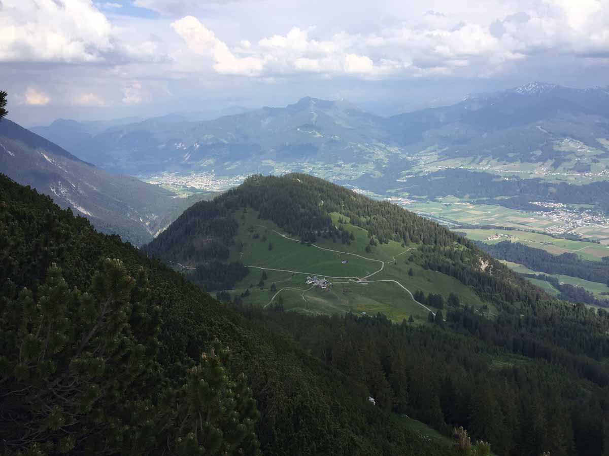 Der Weg hinauf liegt meist im Wald, trotzdem ist es sehr heiß und schwül. Je weiter wir hinaufkommen, desto kühler wird es. Auch die Aussicht wird immer besser, im Oberinntal sehen wir schon die ersten Regengüsse.