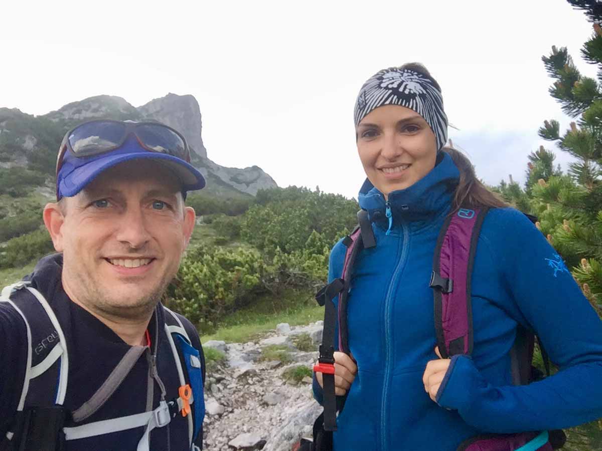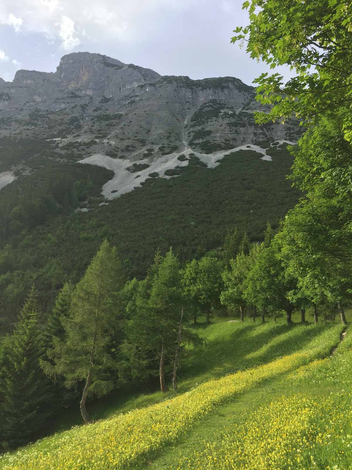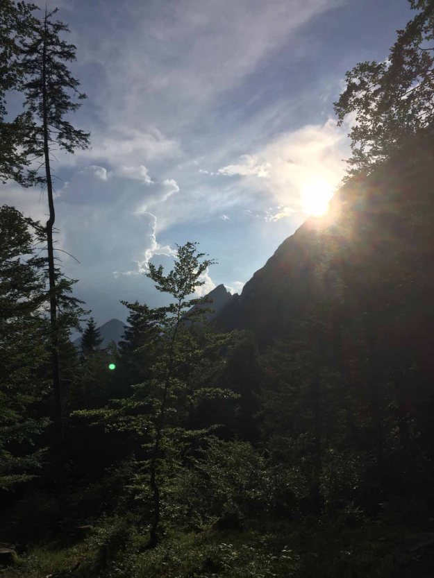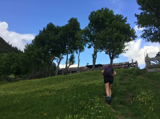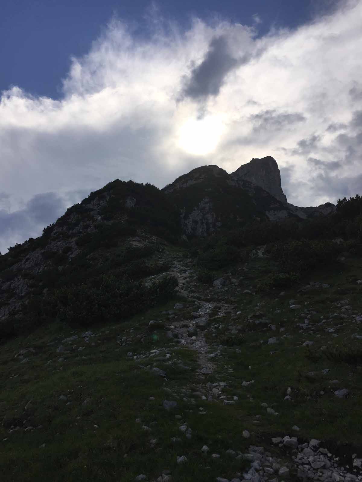 Obwohl das Wetter nicht ganz so stabil ist wie angenommen, wollen wir doch noch eine kurze Afterwork-Bergtour machen. Zuerst ist die Hüttenspitze unser Ziel, doch bei näherem Hinsehen disponieren wir um und gehen auf die Hinterhorner Alm. Diese liegt genau unser einem Wolkenfenster, während die Hüttenspitze schon einen Hut aufhat.