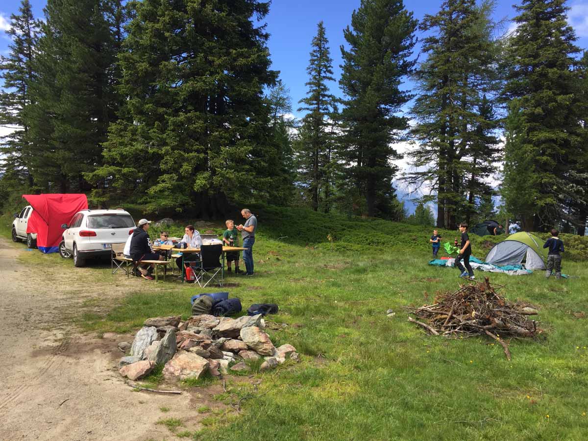Während die großen Jungs versuchen, das Feuer in Gang zu bringen, kühlt der Rest bei starkem Nordwind rasch aus. Daher beschließe ich, mit dem ersten „Schwung“ wieder hinunter zum Issboden zu gehen, denn dort sollte das warme Lagerfeuer schon prasseln. Thomas bleibt mit den Großen noch oben und betreut das Feuer.