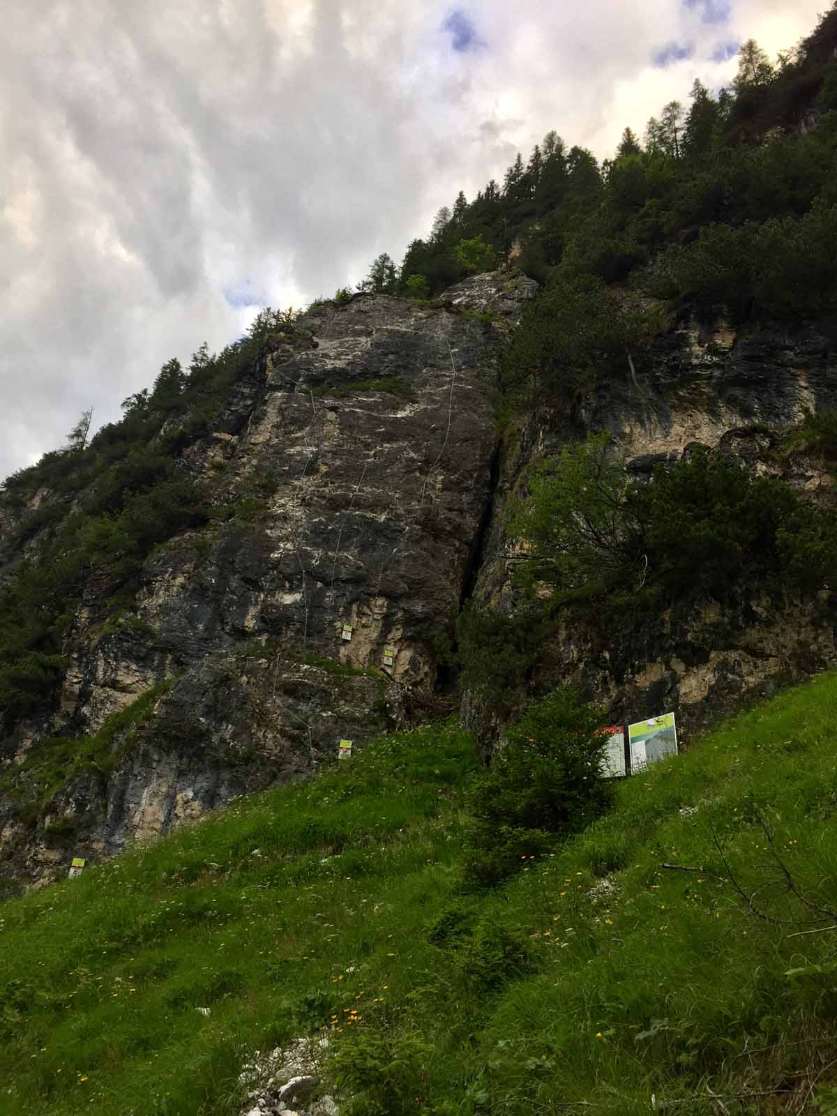 Eine tolle Arbeit wurde hier geleistet. Das ganze Konstrukt trägt nicht den Namen Klettersteig, sondern „Alpine Safety Area“. Beim Einstieg sind 6 Varianten angeführt, ein schwarzer Bergweg (mit Seilgeländer) und Klettersteigvarianten von A-E.