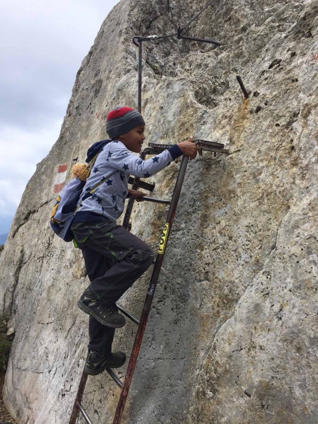 Gleich hinter dem Serlesjöchl ist die Schlüsselstelle, ein Felsriegel mit einer Leiter, nichts Wildes, aber da der Berg so gut besucht ist, schon relativ speckig. Daher muß man seine Schritte gut wählen. Während Letu vorklettert, übernehme ich hinter im die „Sicherungsaufgabe“. Und gut ist es gegangen.
